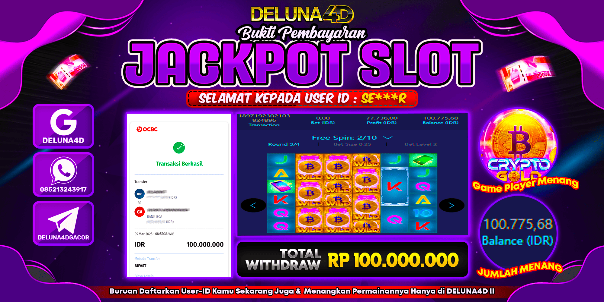 Selamat atas kemenangan User ID : SE***R, yang telah berhasil mendapatkan kemenangan di permainan SLOT CRYPTO GOLD dengan kemenangan sebesar Rp100.000.000,- . Setelah mengisi formulir withdraw, hanya dalam jangka waktu 3 – 5 menitan tim layanan pelanggan DELUNA4D telah berhasil mengirimkan semua saldo kemenangan ke User ID tersebut.