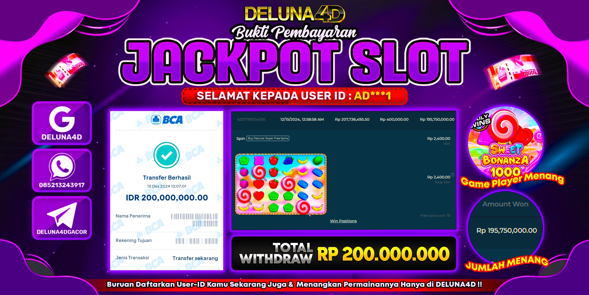 Selamat atas kemenangan User ID : AD***1, yang telah berhasil mendapatkan kemenangan di permainan SLOT GACOR SWEET BONANZA dengan kemenangan sebesar Rp 200.000.000,- . Setelah mengisi formulir withdraw, hanya dalam jangka waktu 3 – 5 menitan tim layanan pelanggan DELUNA4D telah berhasil menegirimkan semua saldo kemenangan ke User ID tersebut.