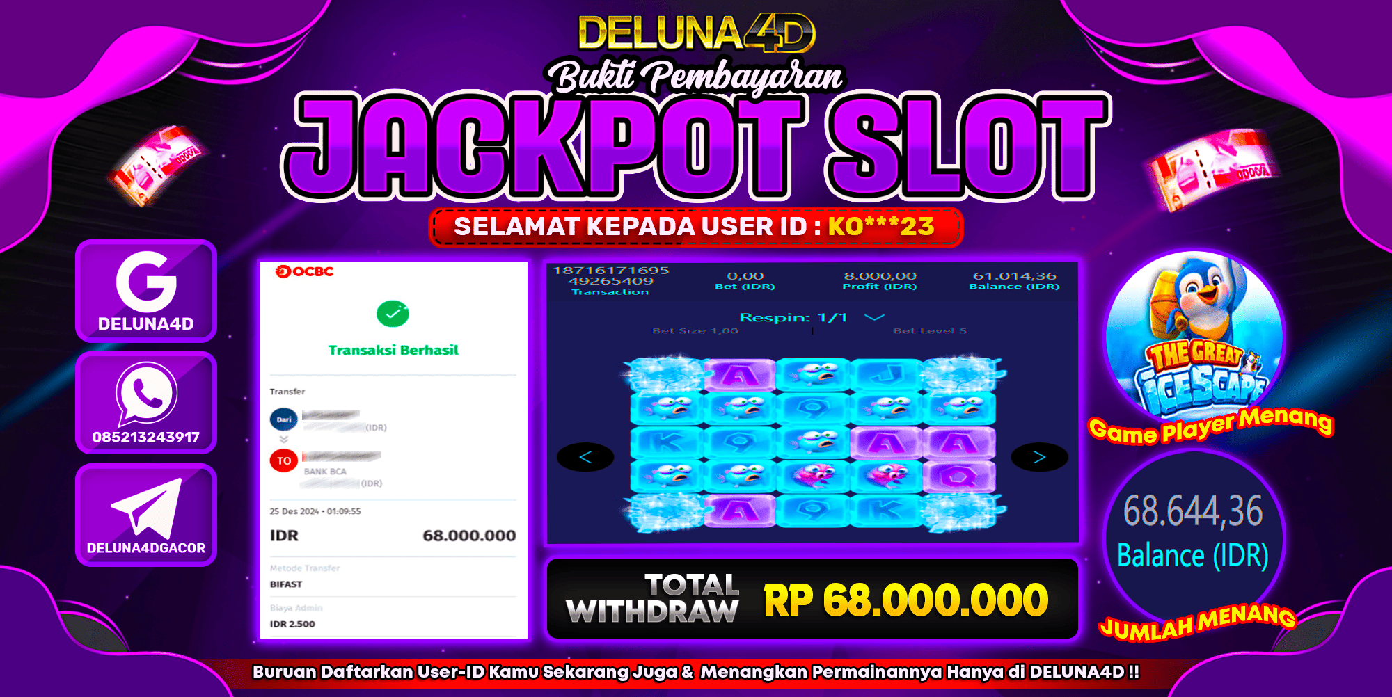 Selamat atas kemenangan User ID : KO***23, yang telah berhasil mendapatkan kemenangan di permainan SLOT GACOR THE GREAT ICESCAPE dengan kemenangan sebesar Rp 68.000.000,- . Setelah mengisi formulir withdraw, hanya dalam jangka waktu 3 – 5 menitan tim layanan pelanggan DELUNA4D telah berhasil mengirimkan semua saldo kemenangan ke User ID tersebut.