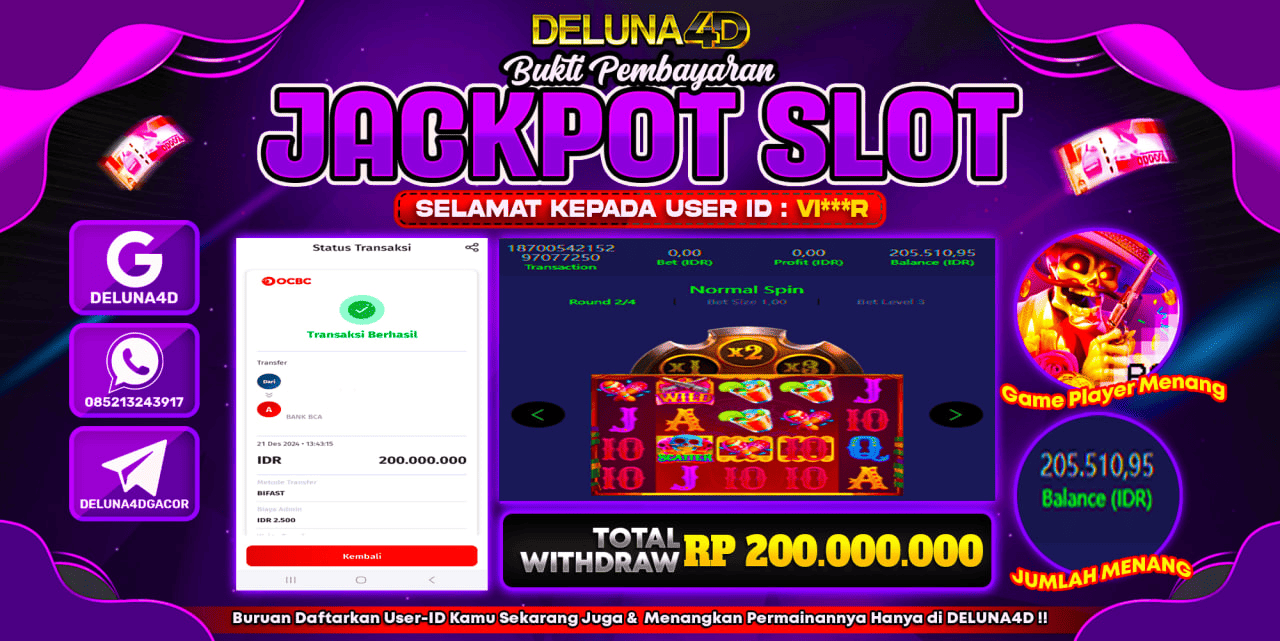 Selamat atas kemenangan User ID : VI***R, yang telah berhasil mendapatkan kemenangan di permainan SLOT GACOR WILD BANDITO dengan kemenangan sebesar Rp 200.000.000,- . Setelah mengisi formulir withdraw, hanya dalam jangka waktu 3 – 5 menitan tim layanan pelanggan DELUNA4D telah berhasil menegirimkan semua saldo kemenangan ke User ID tersebut.