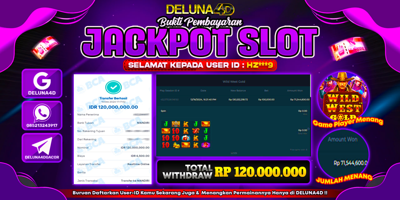 Selamat atas kemenangan User ID : HZ***9, yang telah berhasil mendapatkan kemenangan di permainan SLOT GACOR WILD WEST GOLD dengan kemenangan sebesar Rp 120.000.000,- . Setelah mengisi formulir withdraw, hanya dalam jangka waktu 3 – 5 menitan tim layanan pelanggan DELUNA4D telah berhasil menegirimkan semua saldo kemenangan ke User ID tersebut.