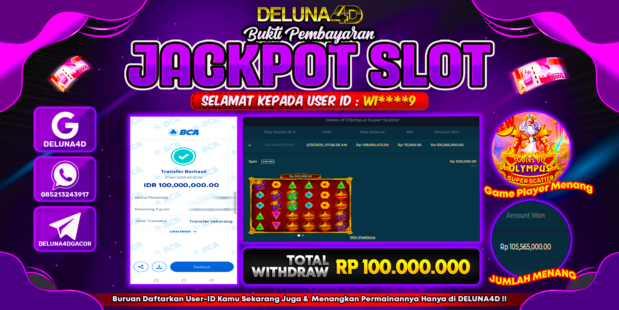 Selamat atas kemenangan User ID : WI***9 yang telah berhasil mendapatkan kemenangan di permainan SLOT GATES OF OLIMPUS SUPER SCATTER dengan kemenangan sebesar Rp100.000.000,- . Setelah mengisi formulir withdraw, hanya dalam jangka waktu 3 – 5 menitan tim layanan pelanggan DELUNA4D telah berhasil mengirimkan semua saldo kemenangan ke User ID tersebut.