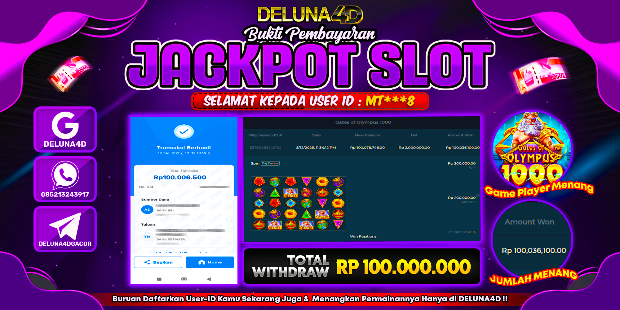 Selamat atas kemenangan User ID : MT****8 yang telah berhasil mendapatkan kemenangan di permainan SLOT GATES OF OLYMPUS 1000 dengan kemenangan sebesar Rp100.000.000,- . Setelah mengisi formulir withdraw, hanya dalam jangka waktu 3 – 5 menitan tim layanan pelanggan DELUNA4D telah berhasil mengirimkan semua saldo kemenangan ke User ID tersebut.