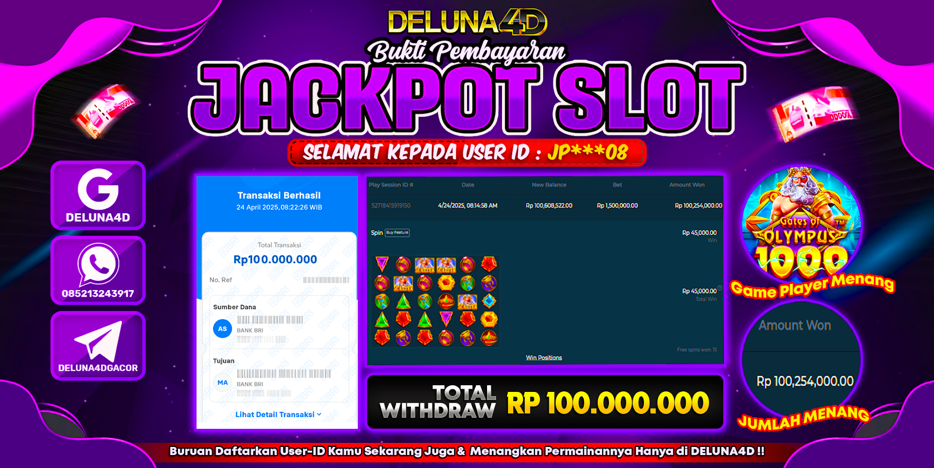 Selamat atas kemenangan User ID : JP***08 yang telah berhasil mendapatkan kemenangan di permainan SLOT GATES OF OLYMPUS 1000 dengan kemenangan sebesar Rp100.000.000,- . Setelah mengisi formulir withdraw, hanya dalam jangka waktu 3 – 5 menitan tim layanan pelanggan DELUNA4D telah berhasil mengirimkan semua saldo kemenangan ke User ID tersebut.