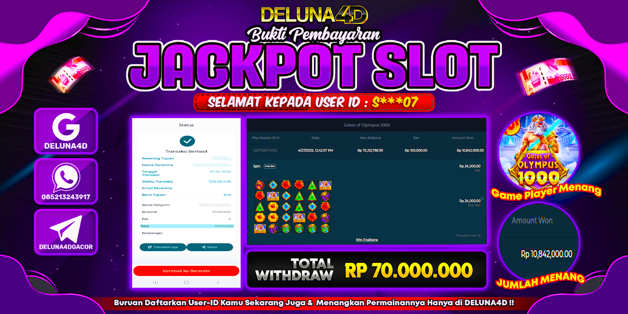 Selamat atas kemenangan User ID : S***07 yang telah berhasil mendapatkan kemenangan di permainan SLOT GATES OF OLYMPUS 1000 dengan kemenangan sebesar Rp70.000.000,- . Setelah mengisi formulir withdraw, hanya dalam jangka waktu 3 – 5 menitan tim layanan pelanggan DELUNA4D telah berhasil mengirimkan semua saldo kemenangan ke User ID tersebut.