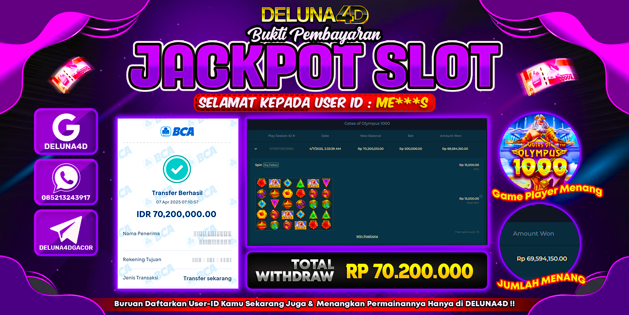 Selamat atas kemenangan User ID : ME***S yang telah berhasil mendapatkan kemenangan di permainan SLOT GATES OF OLYMPUS 1000 dengan kemenangan sebesar Rp70.200.000,- . Setelah mengisi formulir withdraw, hanya dalam jangka waktu 3 – 5 menitan tim layanan pelanggan DELUNA4D telah berhasil mengirimkan semua saldo kemenangan ke User ID tersebut.