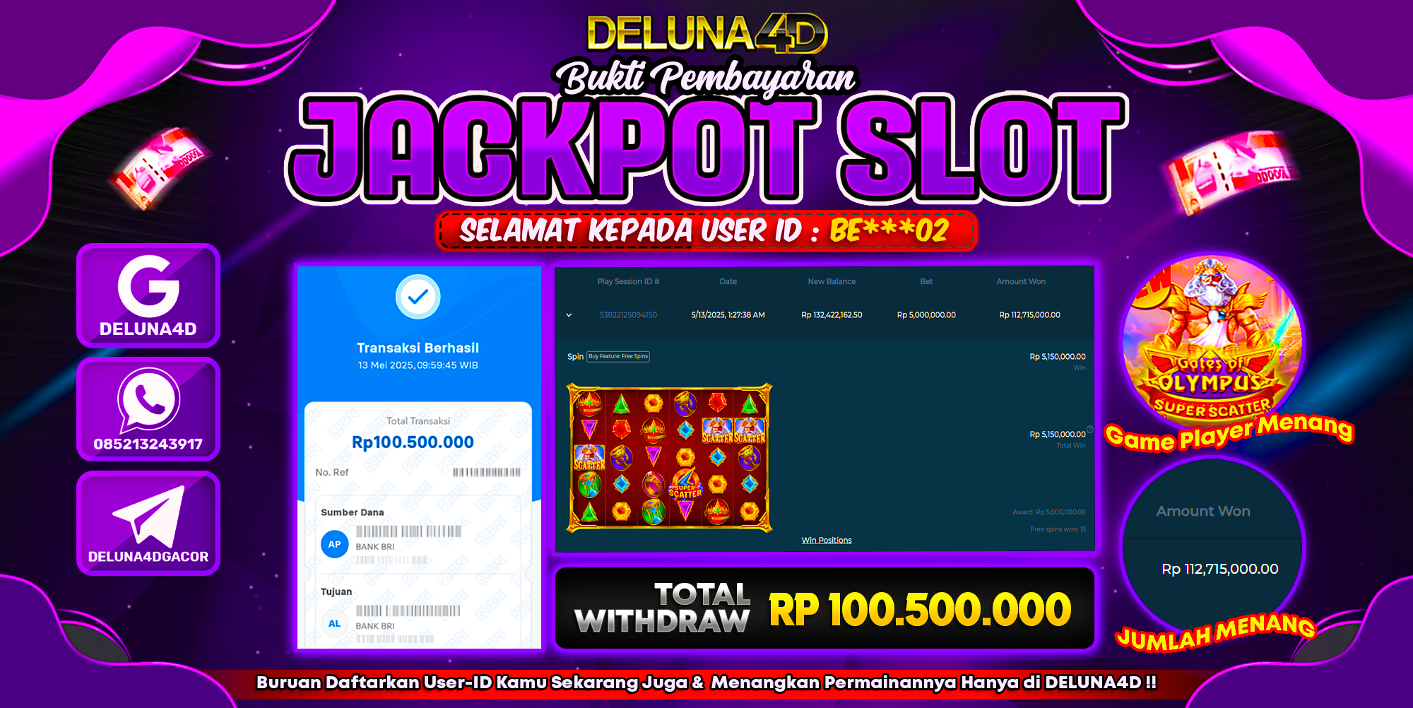 Selamat atas kemenangan User ID : BE****02 yang telah berhasil mendapatkan kemenangan di permainan SLOT GATES OF OLYMPUS SUPER SCATTER dengan kemenangan sebesar Rp100.500.000,- . Setelah mengisi formulir withdraw, hanya dalam jangka waktu 3 – 5 menitan tim layanan pelanggan DELUNA4D telah berhasil mengirimkan semua saldo kemenangan ke User ID tersebut.