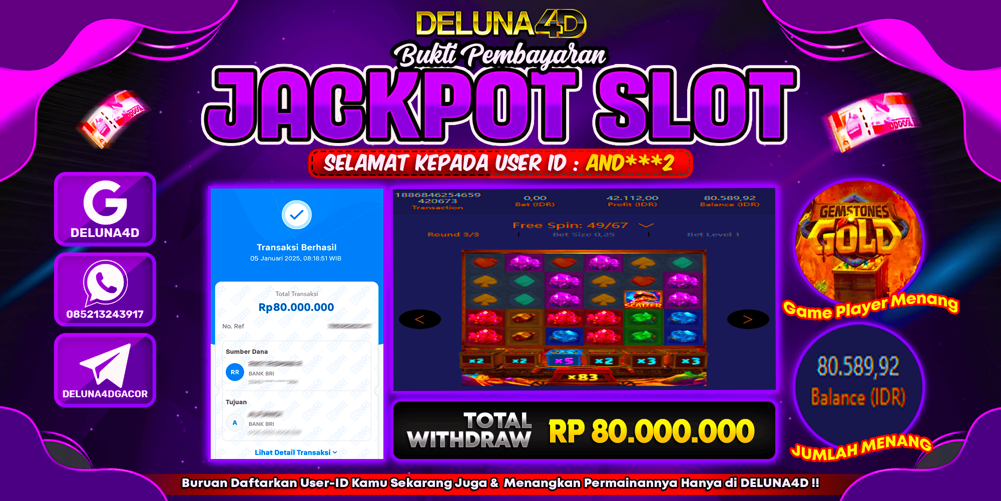 Selamat atas kemenangan User ID : AND***2, yang telah berhasil mendapatkan kemenangan di permainan SLOT GEMSTONE GOLD dengan kemenangan sebesar Rp80.000.000,- . Setelah mengisi formulir withdraw, hanya dalam jangka waktu 3 – 5 menitan tim layanan pelanggan DELUNA4D telah berhasil mengirimkan semua saldo kemenangan ke User ID tersebut.
