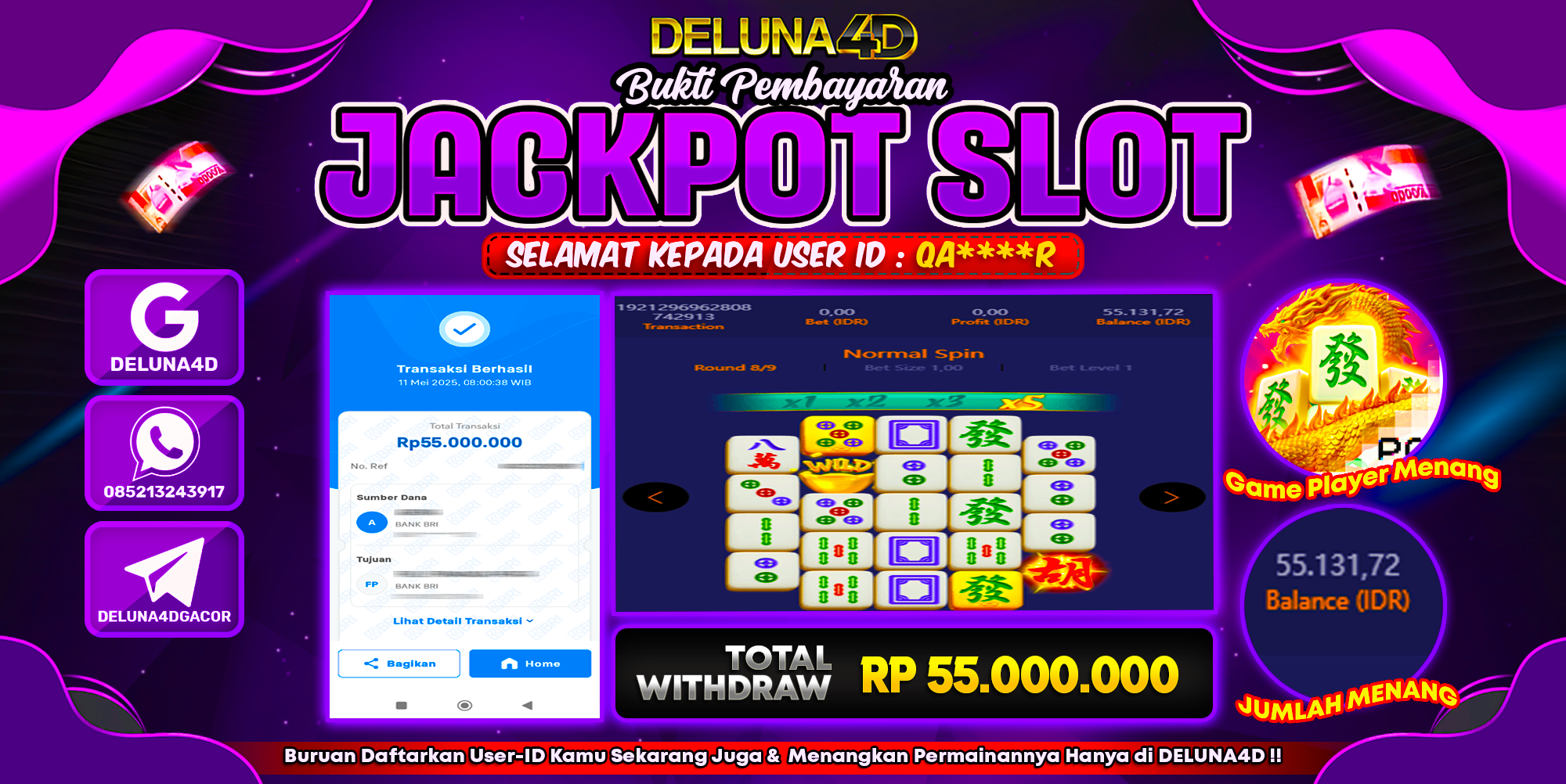 Selamat atas kemenangan User ID : QA****R yang telah berhasil mendapatkan kemenangan di permainan SLOT MAHJONG WAYS 2 dengan kemenangan sebesar Rp55.000.000,- . Setelah mengisi formulir withdraw, hanya dalam jangka waktu 3 – 5 menitan tim layanan pelanggan DELUNA4D telah berhasil mengirimkan semua saldo kemenangan ke User ID tersebut.