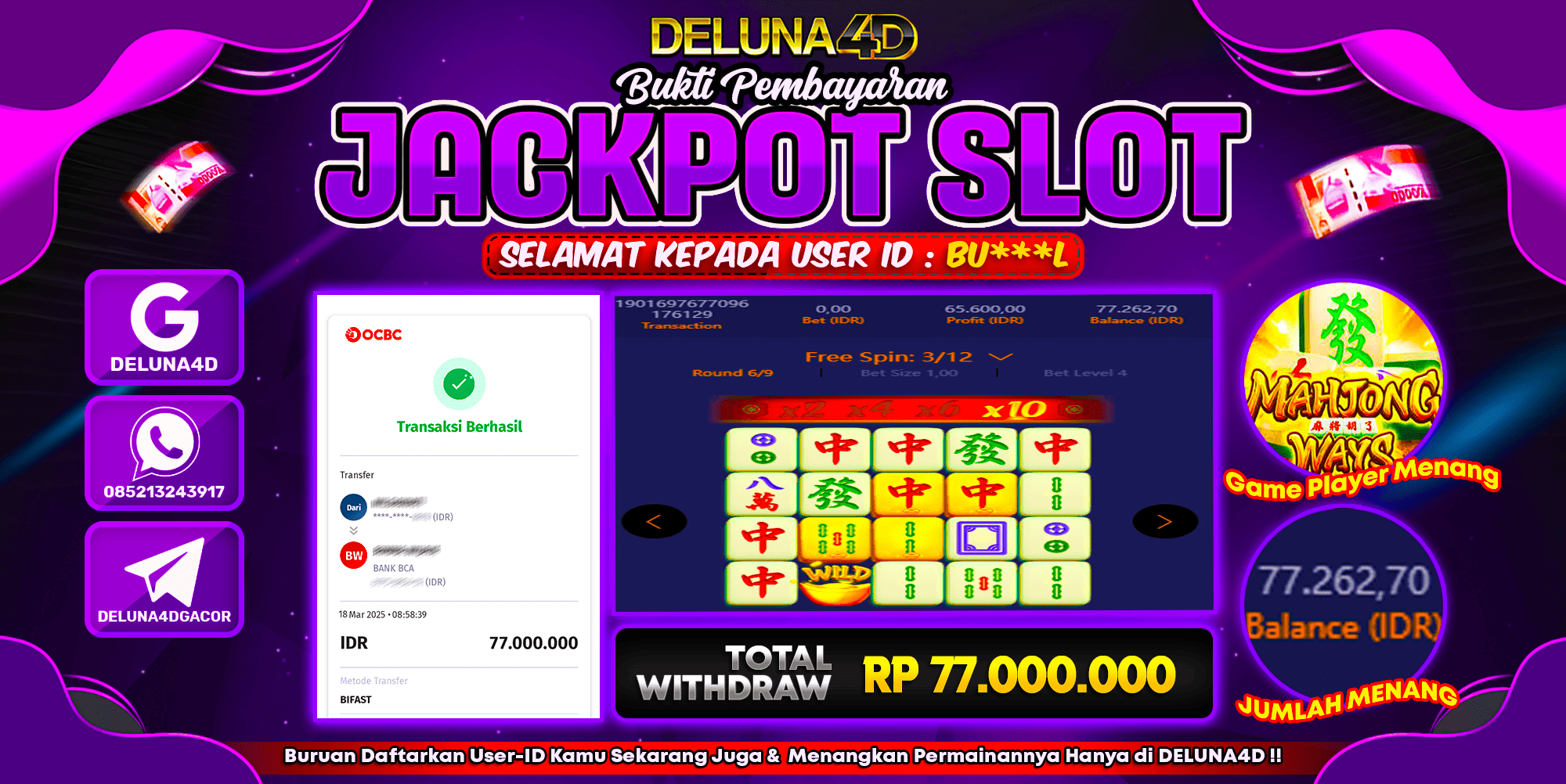 Selamat atas kemenangan User ID : BU***L yang telah berhasil mendapatkan kemenangan di permainan SLOT MAHJONG WAYS dengan kemenangan sebesar Rp77.000.000,- . Setelah mengisi formulir withdraw, hanya dalam jangka waktu 3 – 5 menitan tim layanan pelanggan DELUNA4D telah berhasil mengirimkan semua saldo kemenangan ke User ID tersebut.