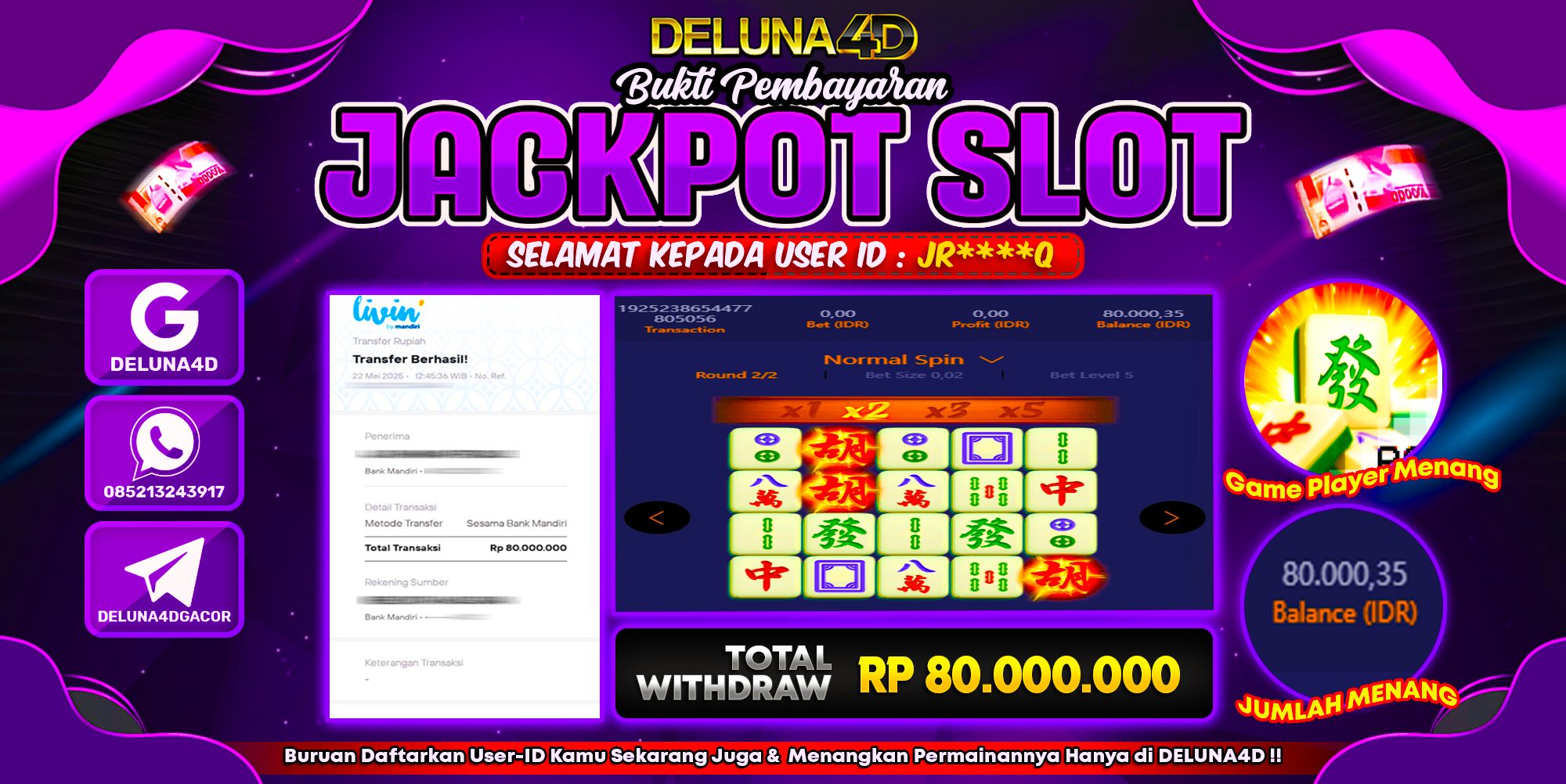 Selamat atas kemenangan User ID : JR***Q yang telah berhasil mendapatkan kemenangan di permainan SLOT MAHJONG WAYS dengan kemenangan sebesar Rp80.000.000,- . Setelah mengisi formulir withdraw, hanya dalam jangka waktu 3 – 5 menitan tim layanan pelanggan DELUNA4D telah berhasil mengirimkan semua saldo kemenangan ke User ID tersebut.