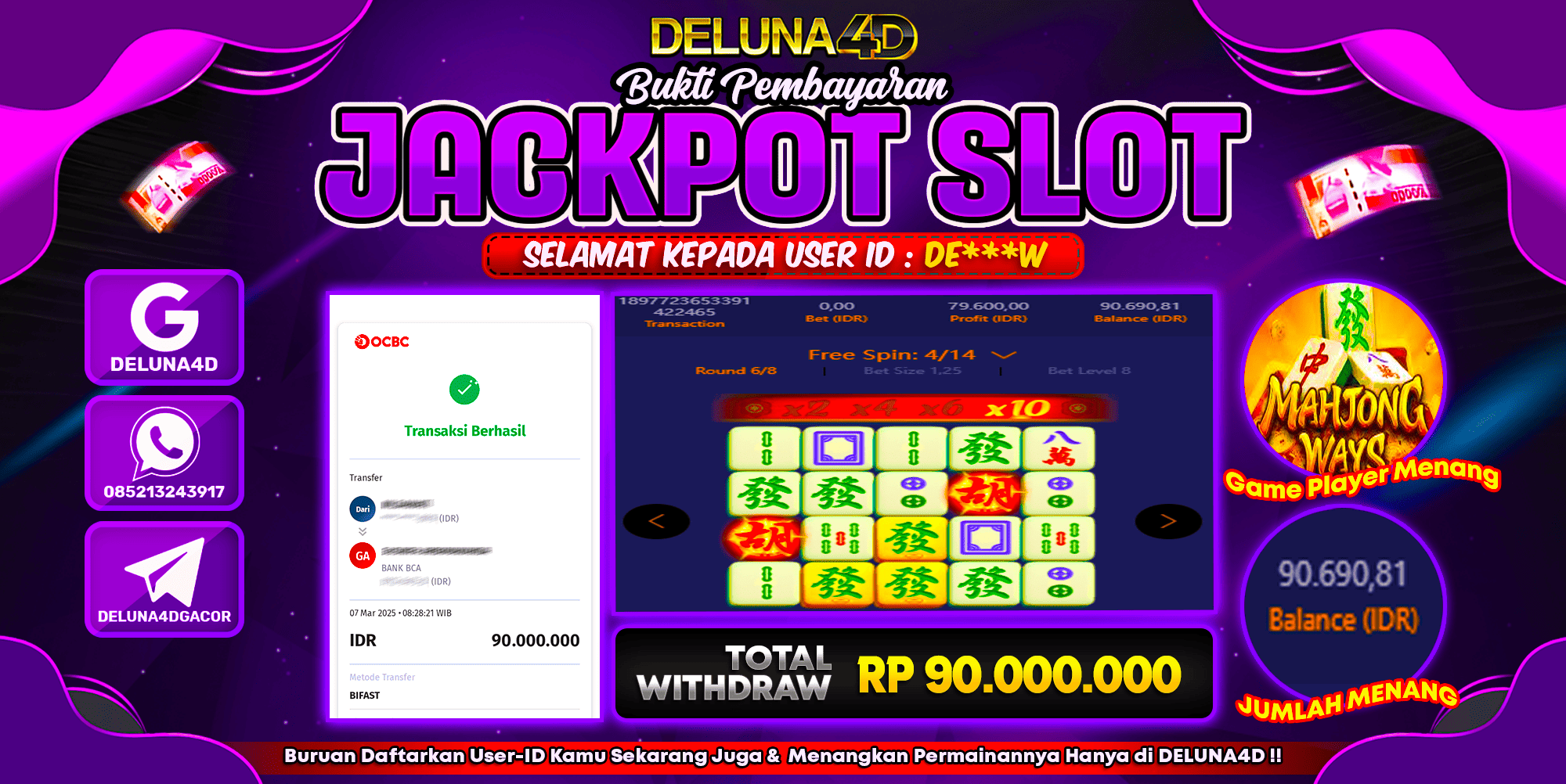 Selamat atas kemenangan User ID : DE***W, yang telah berhasil mendapatkan kemenangan di permainan SLOT MAHJONG WAYS dengan kemenangan sebesar Rp90.000.000,- . Setelah mengisi formulir withdraw, hanya dalam jangka waktu 3 – 5 menitan tim layanan pelanggan DELUNA4D telah berhasil mengirimkan semua saldo kemenangan ke User ID tersebut.