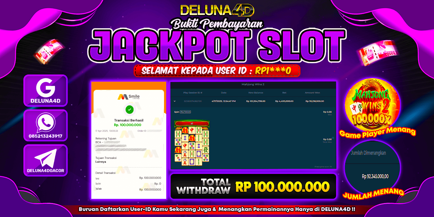 Selamat atas kemenangan User ID : RP1***0 yang telah berhasil mendapatkan kemenangan di permainan SLOT MAHJONG WINS 2 dengan kemenangan sebesar Rp100.000.000,- . Setelah mengisi formulir withdraw, hanya dalam jangka waktu 3 – 5 menitan tim layanan pelanggan DELUNA4D telah berhasil mengirimkan semua saldo kemenangan ke User ID tersebut.