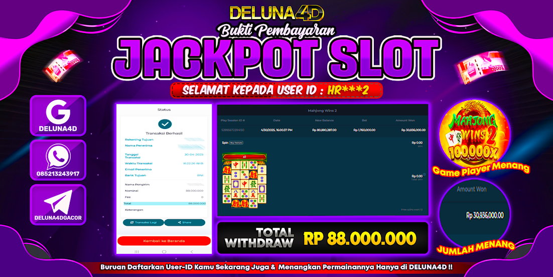 Selamat atas kemenangan User ID : HR***2 yang telah berhasil mendapatkan kemenangan di permainan SLOT MAHJONG WINS 2 dengan kemenangan sebesar Rp88.000.000,- . Setelah mengisi formulir withdraw, hanya dalam jangka waktu 3 – 5 menitan tim layanan pelanggan DELUNA4D telah berhasil mengirimkan semua saldo kemenangan ke User ID tersebut.