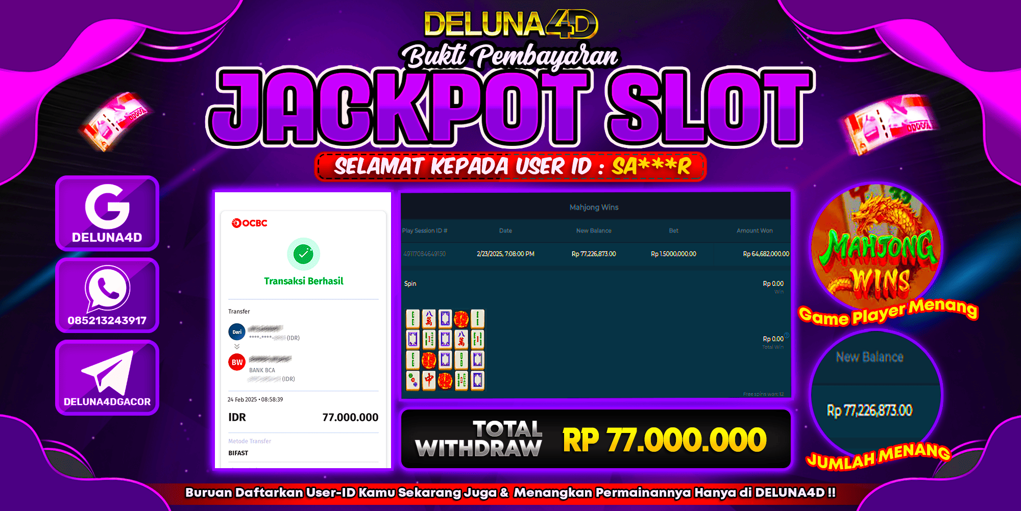 Selamat atas kemenangan User ID : SA***R, yang telah berhasil mendapatkan kemenangan di permainan SLOT MAHJONG WINS dengan kemenangan sebesar Rp77.000.000,- . Setelah mengisi formulir withdraw, hanya dalam jangka waktu 3 – 5 menitan tim layanan pelanggan DELUNA4D telah berhasil mengirimkan semua saldo kemenangan ke User ID tersebut.
