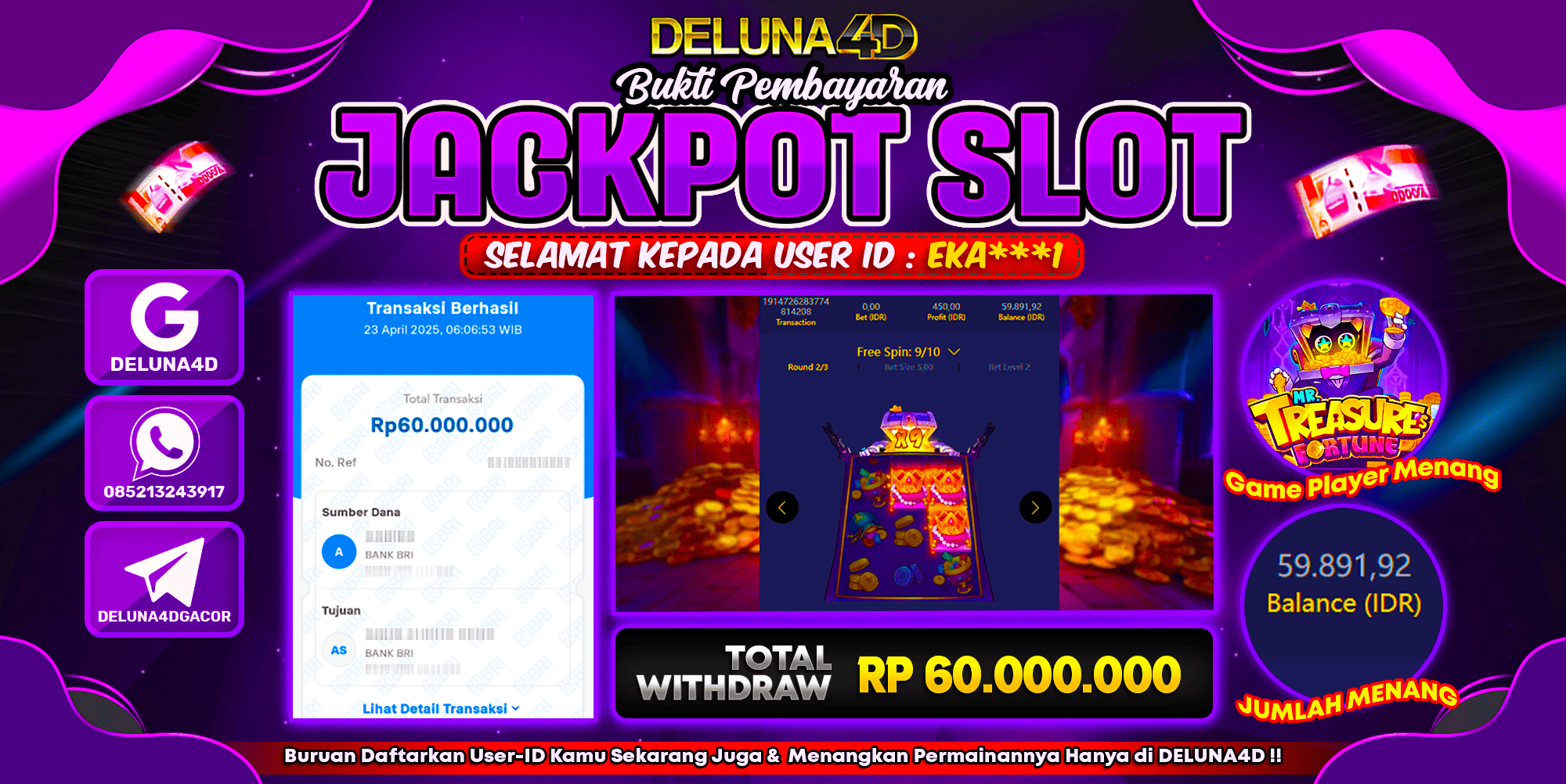 Selamat atas kemenangan User ID : EKA***1 yang telah berhasil mendapatkan kemenangan di permainan SLOT MR TREASURE’S FORTUNE dengan kemenangan sebesar Rp60.000.000,- . Setelah mengisi formulir withdraw, hanya dalam jangka waktu 3 – 5 menitan tim layanan pelanggan DELUNA4D telah berhasil mengirimkan semua saldo kemenangan ke User ID tersebut.