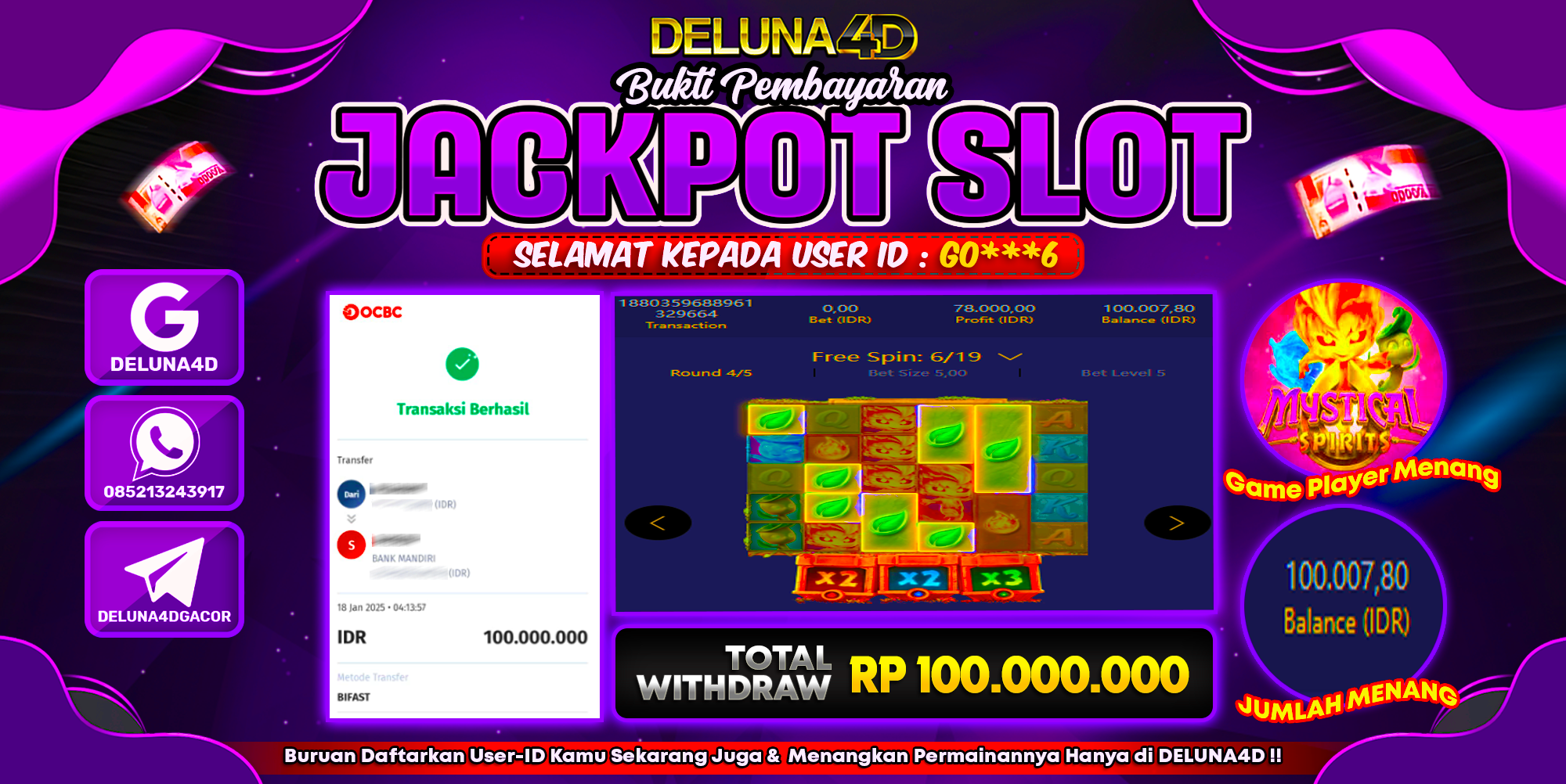 Selamat atas kemenangan User ID : GO***6, yang telah berhasil mendapatkan kemenangan di permainan SLOT MYSTICAL SPIRITS dengan kemenangan sebesar Rp100.000.000,- . Setelah mengisi formulir withdraw, hanya dalam jangka waktu 3 – 5 menitan tim layanan pelanggan DELUNA4D telah berhasil mengirimkan semua saldo kemenangan ke User ID tersebut.