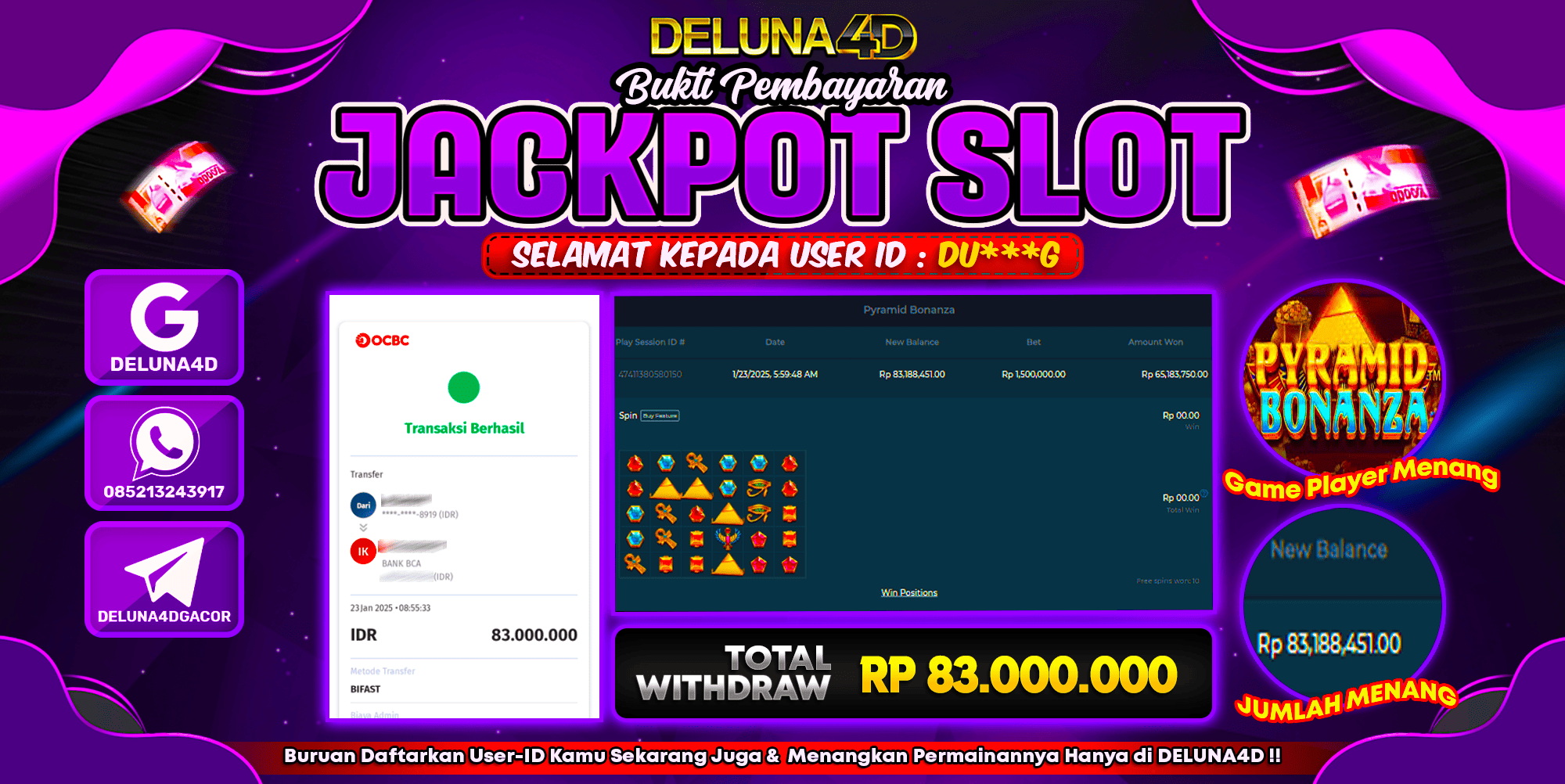 Selamat atas kemenangan User ID : DU***G, yang telah berhasil mendapatkan kemenangan di permainan SLOT PYRAMID BONANZA dengan kemenangan sebesar Rp83.000.000,- . Setelah mengisi formulir withdraw, hanya dalam jangka waktu 3 – 5 menitan tim layanan pelanggan DELUNA4D telah berhasil mengirimkan semua saldo kemenangan ke User ID tersebut.