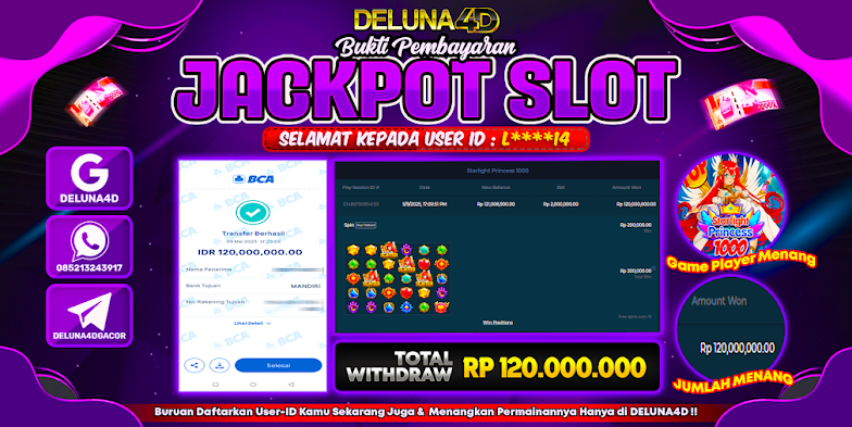 Selamat atas kemenangan User ID : L***14 yang telah berhasil mendapatkan kemenangan di permainan SLOT STARLIGHT PRINCESS 1000 dengan kemenangan sebesar Rp120.000.000,- . Setelah mengisi formulir withdraw, hanya dalam jangka waktu 3 – 5 menitan tim layanan pelanggan DELUNA4D telah berhasil mengirimkan semua saldo kemenangan ke User ID tersebut.