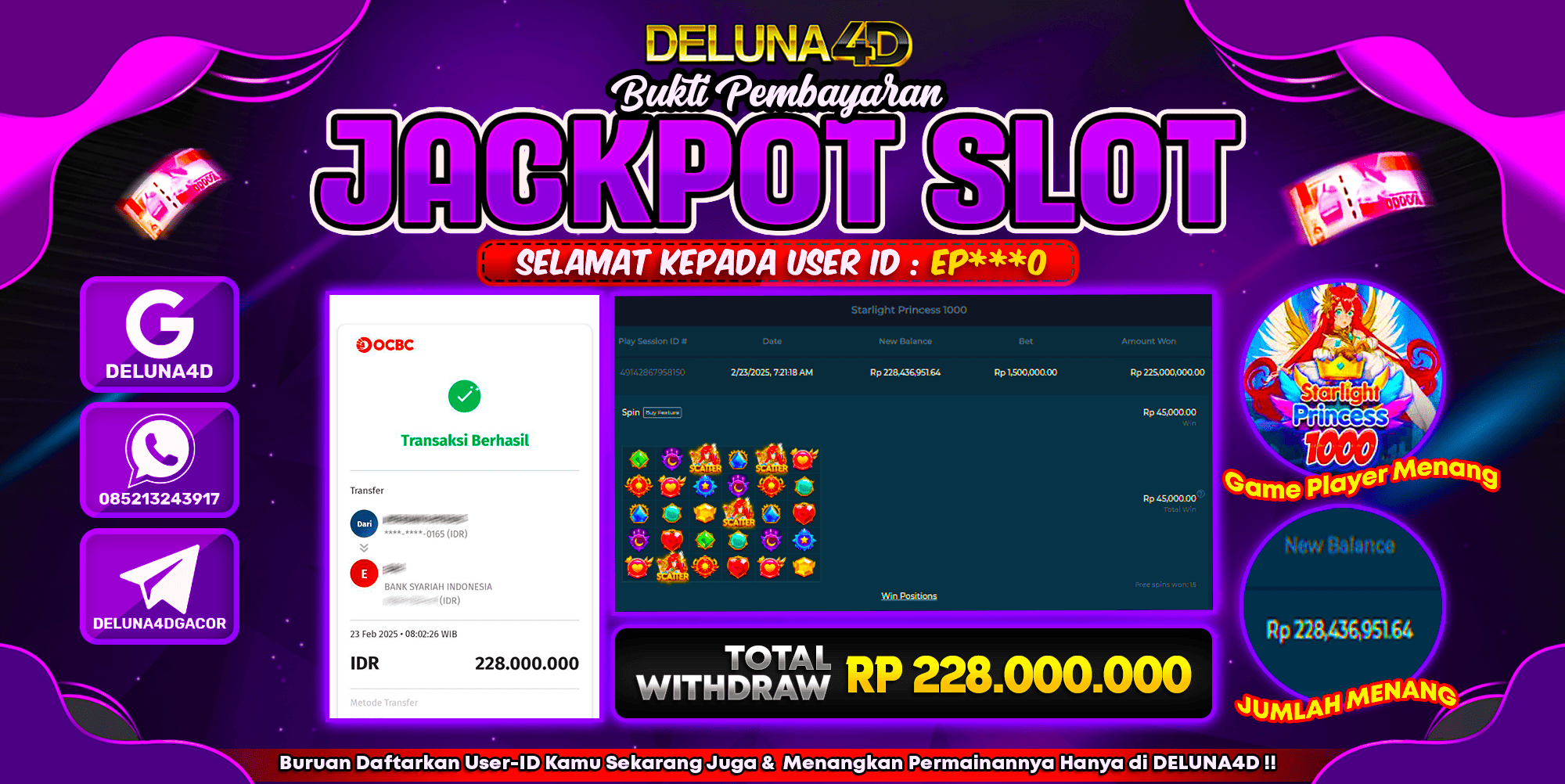 Selamat atas kemenangan User ID : EP***0, yang telah berhasil mendapatkan kemenangan di permainan SLOT STARLIGHT PRINCESS 1000 dengan kemenangan sebesar Rp228.000.000,- . Setelah mengisi formulir withdraw, hanya dalam jangka waktu 3 – 5 menitan tim layanan pelanggan DELUNA4D telah berhasil mengirimkan semua saldo kemenangan ke User ID tersebut.