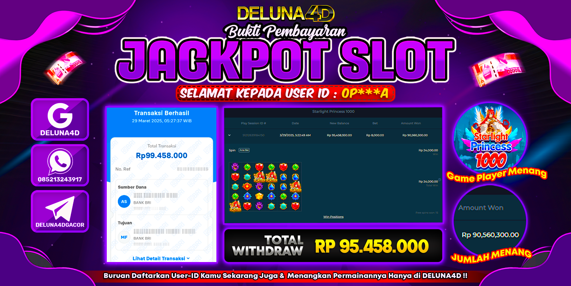 Selamat atas kemenangan User ID : OP***A yang telah berhasil mendapatkan kemenangan di permainan SLOT STARLIGHT PRINCESS 1000 dengan kemenangan sebesar Rp95.458.000,- . Setelah mengisi formulir withdraw, hanya dalam jangka waktu 3 – 5 menitan tim layanan pelanggan DELUNA4D telah berhasil mengirimkan semua saldo kemenangan ke User ID tersebut.