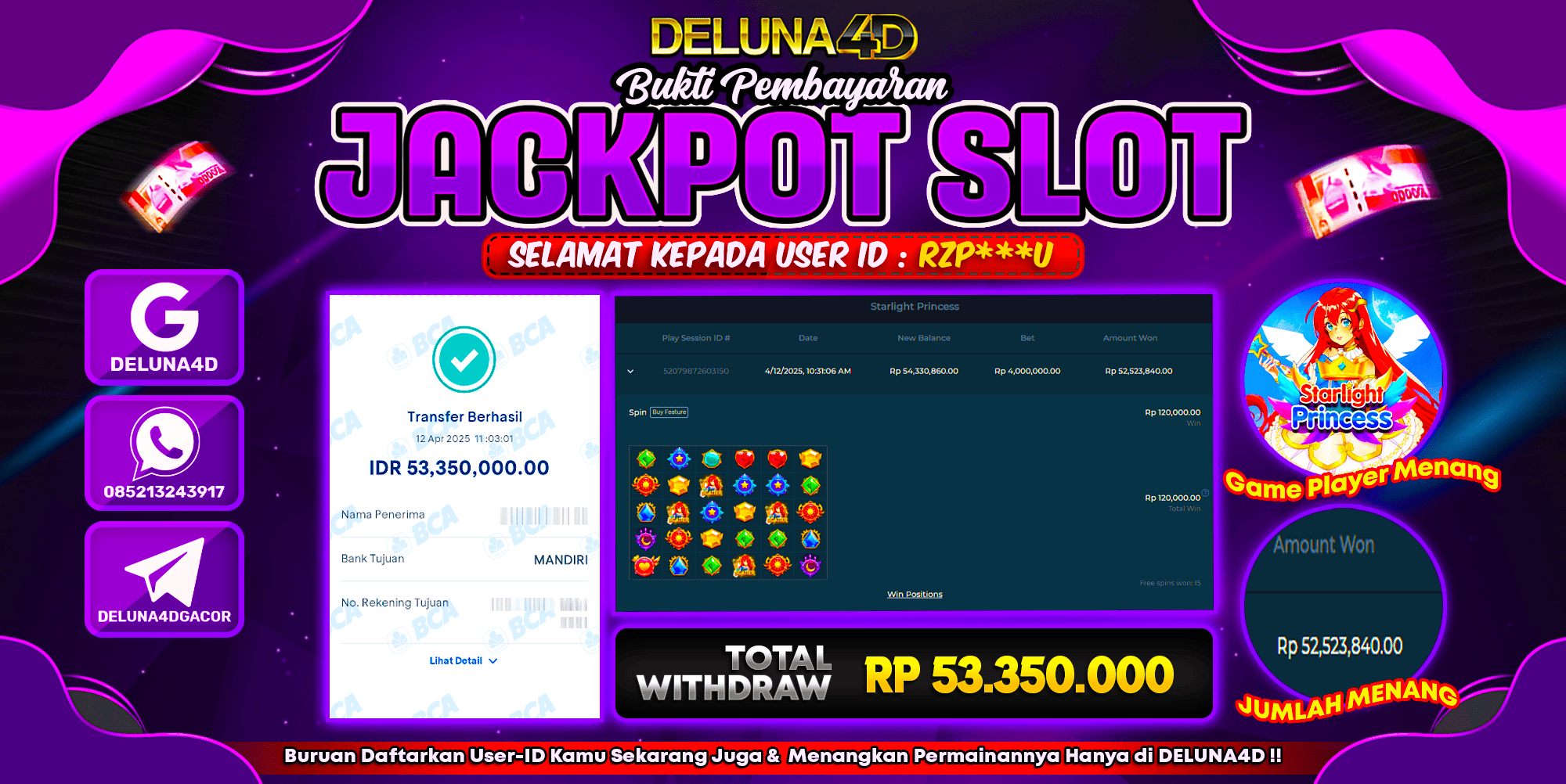 Selamat atas kemenangan User ID : RZP***U yang telah berhasil mendapatkan kemenangan di permainan SLOT STARLIGHT PRINCESS dengan kemenangan sebesar Rp53.350.000,- . Setelah mengisi formulir withdraw, hanya dalam jangka waktu 3 – 5 menitan tim layanan pelanggan DELUNA4D telah berhasil mengirimkan semua saldo kemenangan ke User ID tersebut.