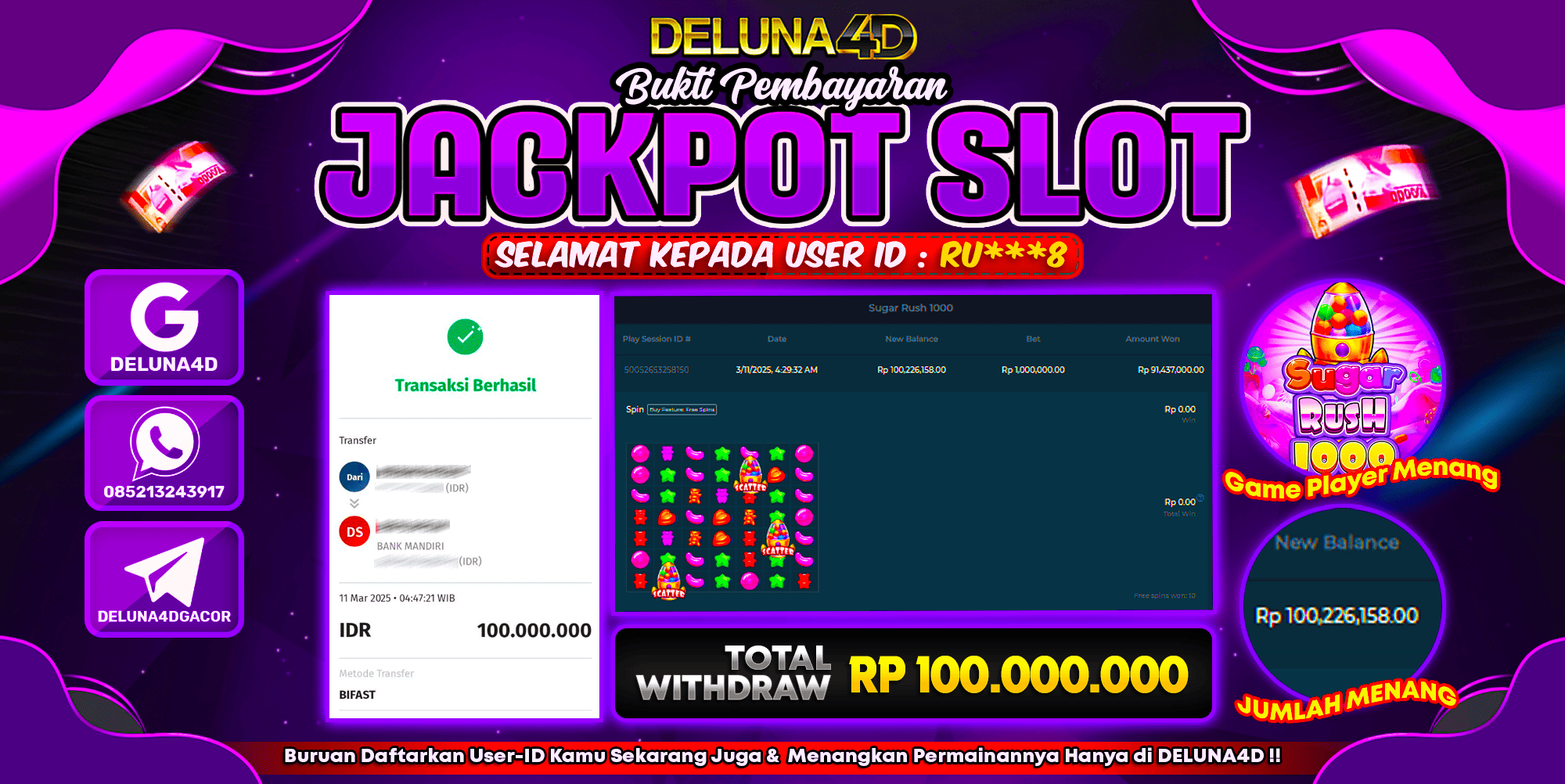 Selamat atas kemenangan User ID : RU***8, yang telah berhasil mendapatkan kemenangan di permainan SLOT SUGAR RUSH 1000 dengan kemenangan sebesar Rp100.000.000,- . Setelah mengisi formulir withdraw, hanya dalam jangka waktu 3 – 5 menitan tim layanan pelanggan DELUNA4D telah berhasil mengirimkan semua saldo kemenangan ke User ID tersebut.