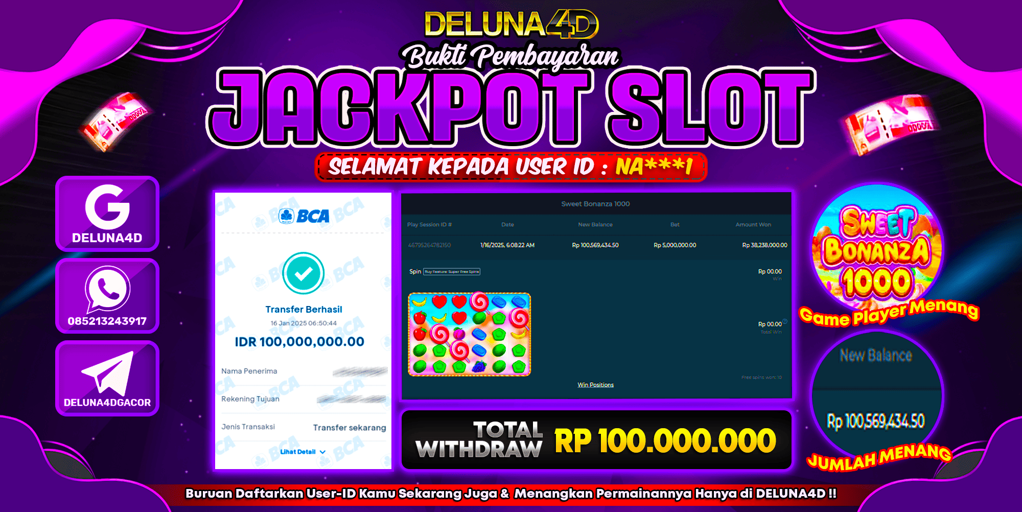 Selamat atas kemenangan User ID : NA***1, yang telah berhasil mendapatkan kemenangan di permainan SLOT SWEET BONANZA 1000 dengan kemenangan sebesar Rp100.000.000,- . Setelah mengisi formulir withdraw, hanya dalam jangka waktu 3 – 5 menitan tim layanan pelanggan DELUNA4D telah berhasil mengirimkan semua saldo kemenangan ke User ID tersebut.