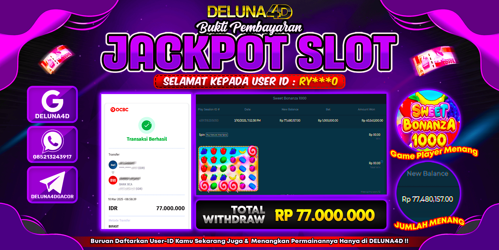Selamat atas kemenangan User ID : RY***O, yang telah berhasil mendapatkan kemenangan di permainan SLOT SWEET BONANZA 1000 dengan kemenangan sebesar Rp77.000.000,- . Setelah mengisi formulir withdraw, hanya dalam jangka waktu 3 – 5 menitan tim layanan pelanggan DELUNA4D telah berhasil mengirimkan semua saldo kemenangan ke User ID tersebut.