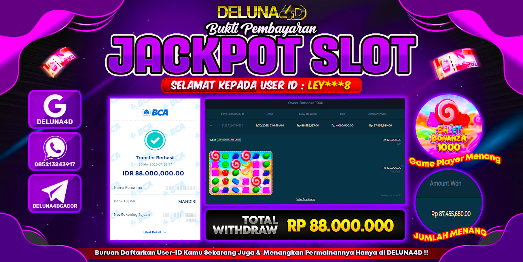 Selamat atas kemenangan User ID : LEY***8 yang telah berhasil mendapatkan kemenangan di permainan SLOT SWEET BONANZA 1000 dengan kemenangan sebesar Rp88.000.000,- . Setelah mengisi formulir withdraw, hanya dalam jangka waktu 3 – 5 menitan tim layanan pelanggan DELUNA4D telah berhasil mengirimkan semua saldo kemenangan ke User ID tersebut.