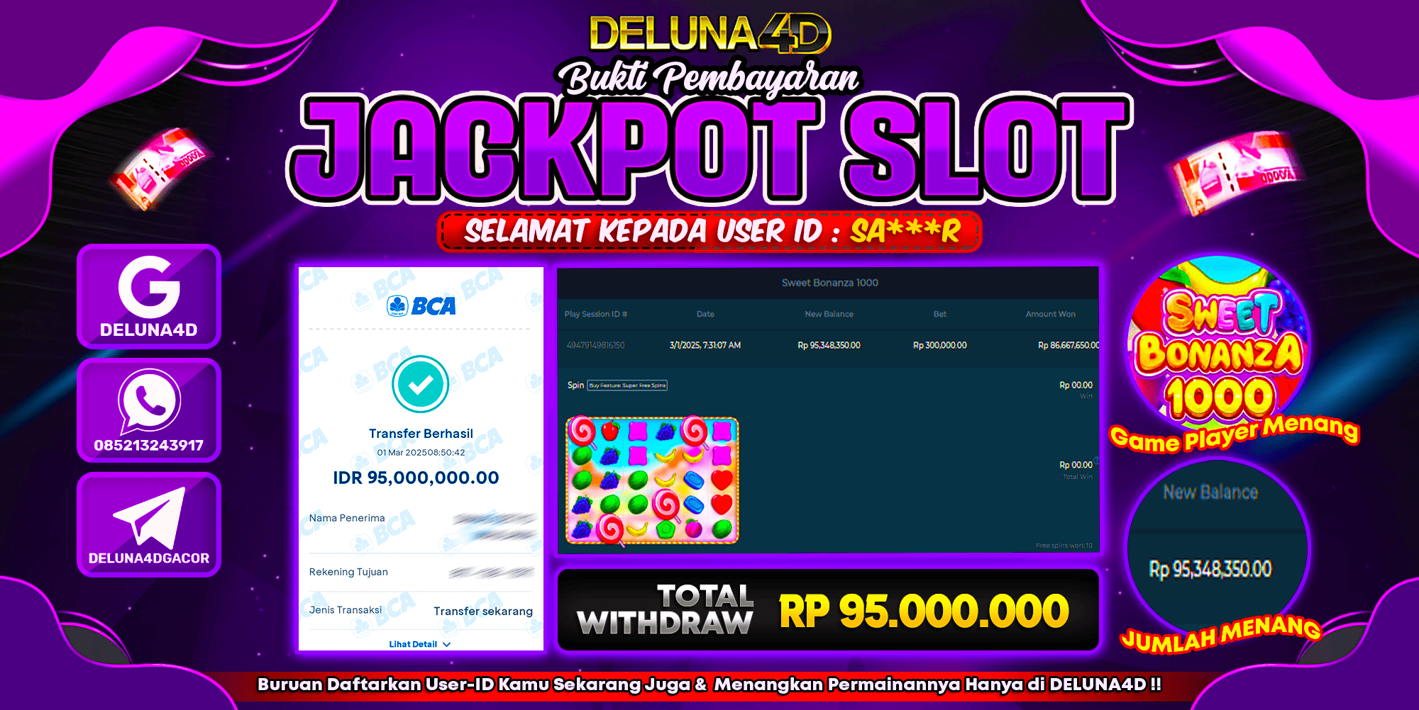 Selamat atas kemenangan User ID : SA***R, yang telah berhasil mendapatkan kemenangan di permainan SLOT SWEET BONANZA 1000 dengan kemenangan sebesar Rp95.000.000,- . Setelah mengisi formulir withdraw, hanya dalam jangka waktu 3 – 5 menitan tim layanan pelanggan DELUNA4D telah berhasil mengirimkan semua saldo kemenangan ke User ID tersebut.