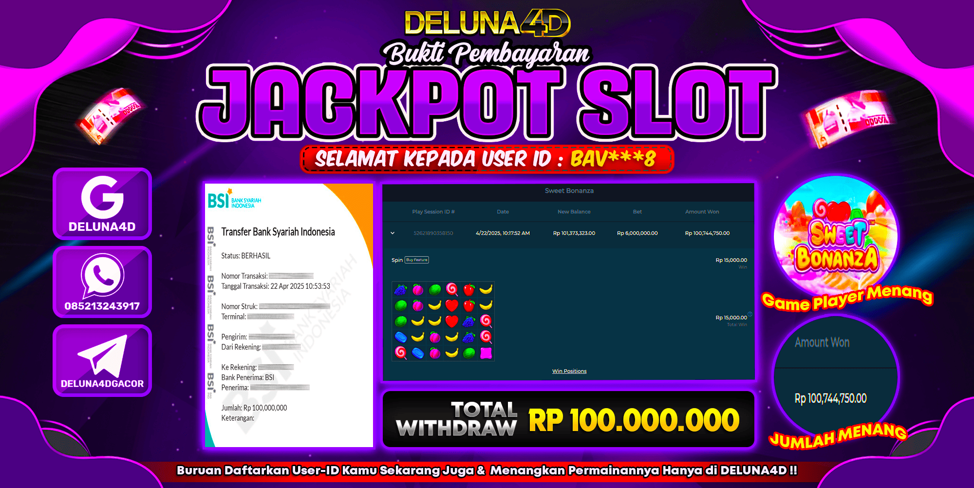 Selamat atas kemenangan User ID : BAV***8 yang telah berhasil mendapatkan kemenangan di permainan SLOT SWEET BONANZA dengan kemenangan sebesar Rp100.000.000,- . Setelah mengisi formulir withdraw, hanya dalam jangka waktu 3 – 5 menitan tim layanan pelanggan DELUNA4D telah berhasil mengirimkan semua saldo kemenangan ke User ID tersebut.