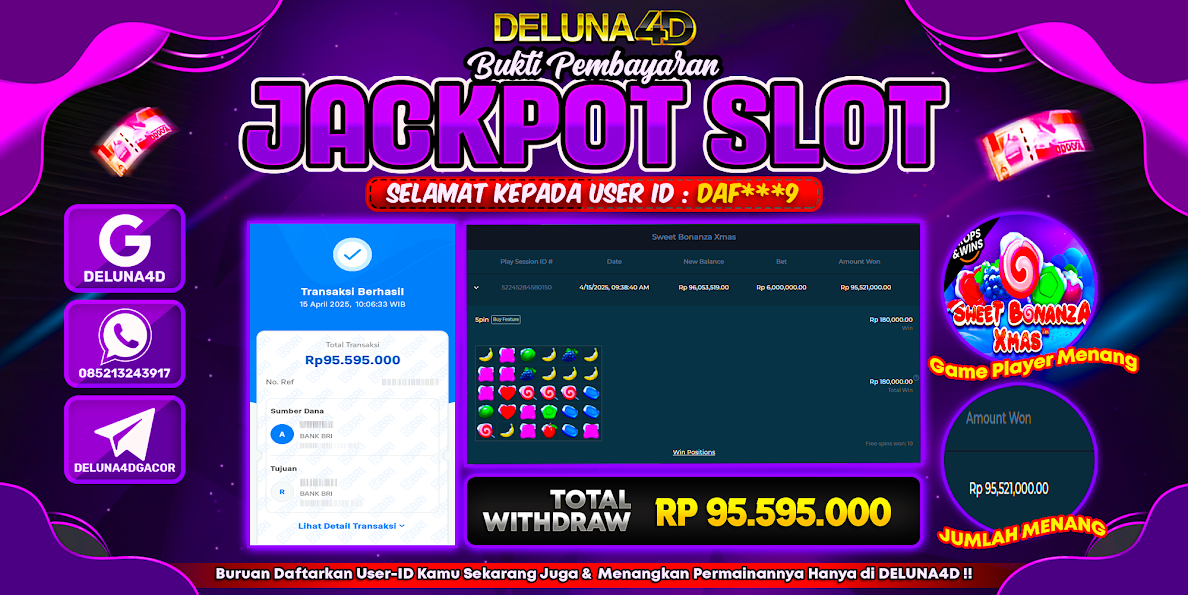 Selamat atas kemenangan User ID : DAF***9 yang telah berhasil mendapatkan kemenangan di permainan SLOT SWEET BONANZA XMAS dengan kemenangan sebesar Rp95.595.000,- . Setelah mengisi formulir withdraw, hanya dalam jangka waktu 3 – 5 menitan tim layanan pelanggan DELUNA4D telah berhasil mengirimkan semua saldo kemenangan ke User ID tersebut.