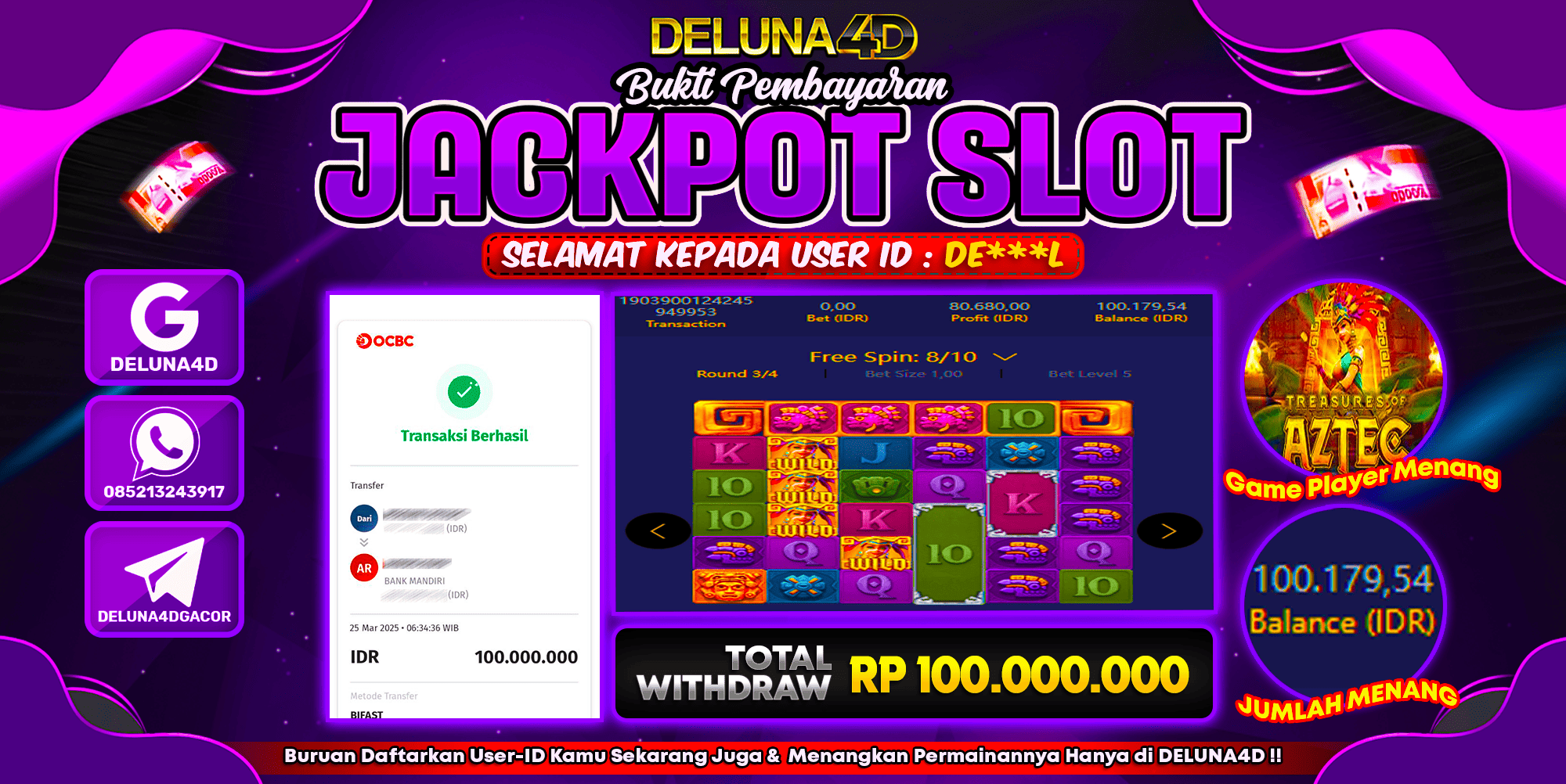 Selamat atas kemenangan User ID : DE***L yang telah berhasil mendapatkan kemenangan di permainan SLOT TREASURE OF AZTEC dengan kemenangan sebesar Rp100.000.000,- . Setelah mengisi formulir withdraw, hanya dalam jangka waktu 3 – 5 menitan tim layanan pelanggan DELUNA4D telah berhasil mengirimkan semua saldo kemenangan ke User ID tersebut.