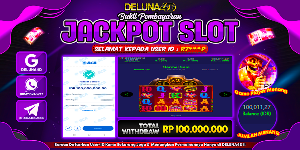 Selamat atas kemenangan User ID : R7***P yang telah berhasil mendapatkan kemenangan di permainan SLOT WILD BANDITO dengan kemenangan sebesar Rp100.000.000,- . Setelah mengisi formulir withdraw, hanya dalam jangka waktu 3 – 5 menitan tim layanan pelanggan DELUNA4D telah berhasil mengirimkan semua saldo kemenangan ke User ID tersebut.