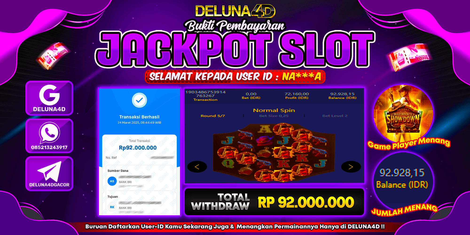 Selamat atas kemenangan User ID : NA***A yang telah berhasil mendapatkan kemenangan di permainan SLOT WILD BOUNTY SHOWDOWN dengan kemenangan sebesar Rp92.000.000,- . Setelah mengisi formulir withdraw, hanya dalam jangka waktu 3 – 5 menitan tim layanan pelanggan DELUNA4D telah berhasil mengirimkan semua saldo kemenangan ke User ID tersebut.