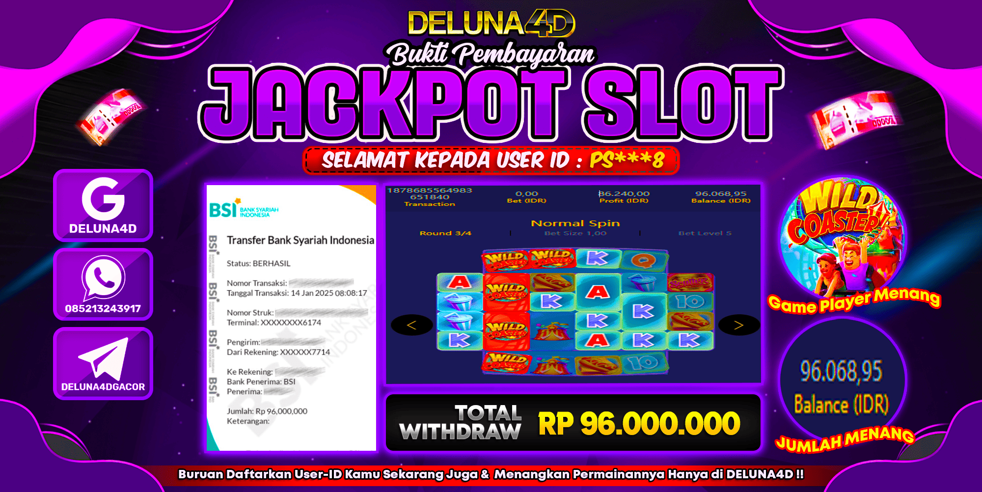 Selamat atas kemenangan User ID : PS***8, yang telah berhasil mendapatkan kemenangan di permainan SLOT WILD COASTER dengan kemenangan sebesar Rp96.000.000,- . Setelah mengisi formulir withdraw, hanya dalam jangka waktu 3 – 5 menitan tim layanan pelanggan DELUNA4D telah berhasil mengirimkan semua saldo kemenangan ke User ID tersebut.