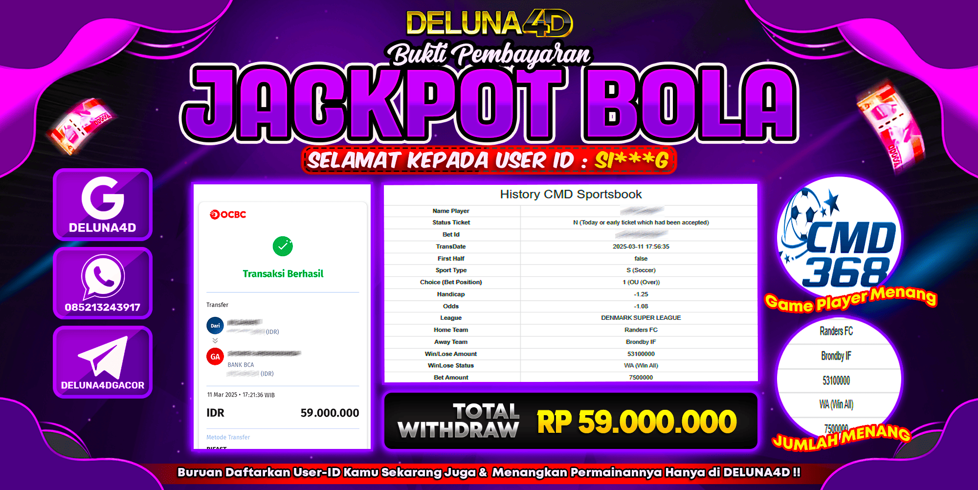 Selamat atas kemenangan User ID : SI***G, yang telah berhasil mendapatkan kemenangan di permainan SPORTBOOK CMD SPORTS dengan kemenangan sebesar Rp59.000.000,- . Setelah mengisi formulir withdraw, hanya dalam jangka waktu 3 – 5 menitan tim layanan pelanggan DELUNA4D telah berhasil mengirimkan semua saldo kemenangan ke User ID tersebut.