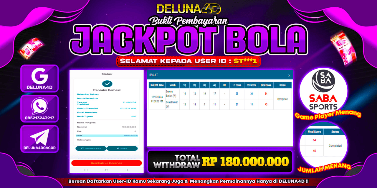 Selamat atas kemenangan User ID : ST***1, yang telah berhasil mendapatkan kemenangan di permainan SPORTBOOK SABA SPORT dengan kemenangan sebesar Rp 180.000.000,- . Setelah mengisi formulir withdraw, hanya dalam jangka waktu 3 – 5 menitan tim layanan pelanggan DELUNA4D telah berhasil menegirimkan semua saldo kemenangan ke User ID tersebut.