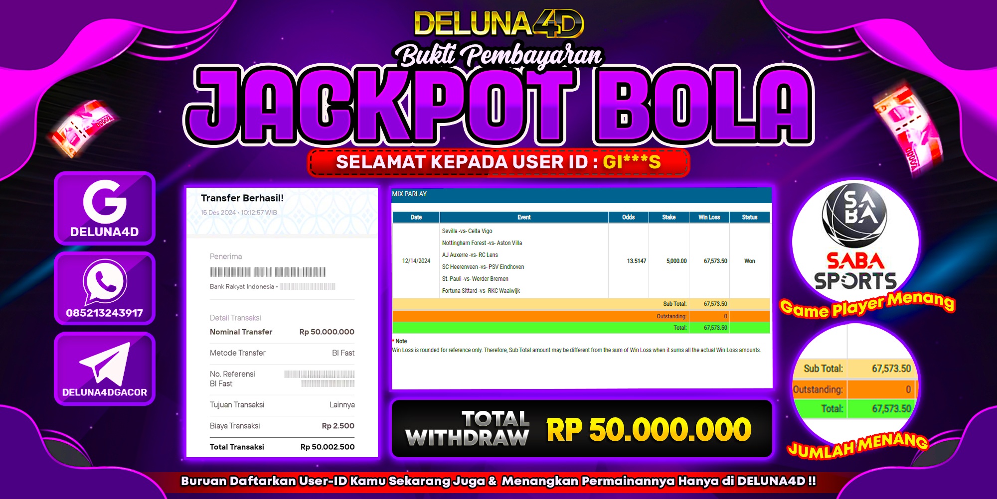 Selamat atas kemenangan User ID : ME***L, yang telah berhasil mendapatkan kemenangan di permainan SPORTBOOK SABA SPORT dengan kemenangan sebesar Rp 50.000.000,- . Setelah mengisi formulir withdraw, hanya dalam jangka waktu 3 – 5 menitan tim layanan pelanggan DELUNA4D telah berhasil menegirimkan semua saldo kemenangan ke User ID tersebut.