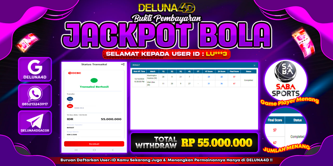 Selamat atas kemenangan User ID : LU***3, yang telah berhasil mendapatkan kemenangan di permainan SPORTBOOK SABA SPORT dengan kemenangan sebesar Rp 55.000.000,- . Setelah mengisi formulir withdraw, hanya dalam jangka waktu 3 – 5 menitan tim layanan pelanggan DELUNA4D telah berhasil menegirimkan semua saldo kemenangan ke User ID tersebut.