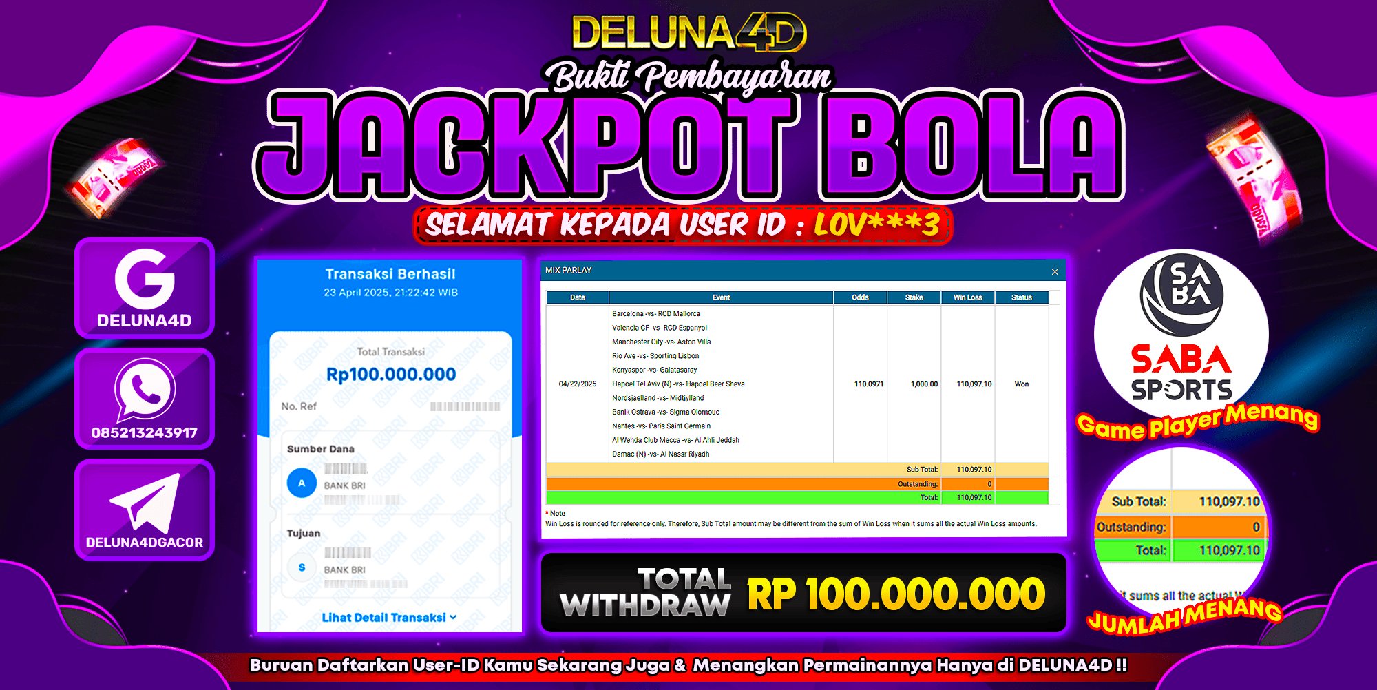 Selamat atas kemenangan User ID : LOV***3, yang telah berhasil mendapatkan kemenangan di permainan SPORTBOOK SABA SPORTS dengan kemenangan sebesar Rp100.000.000,- . Setelah mengisi formulir withdraw, hanya dalam jangka waktu 3 – 5 menitan tim layanan pelanggan DELUNA4D telah berhasil mengirimkan semua saldo kemenangan ke User ID tersebut.