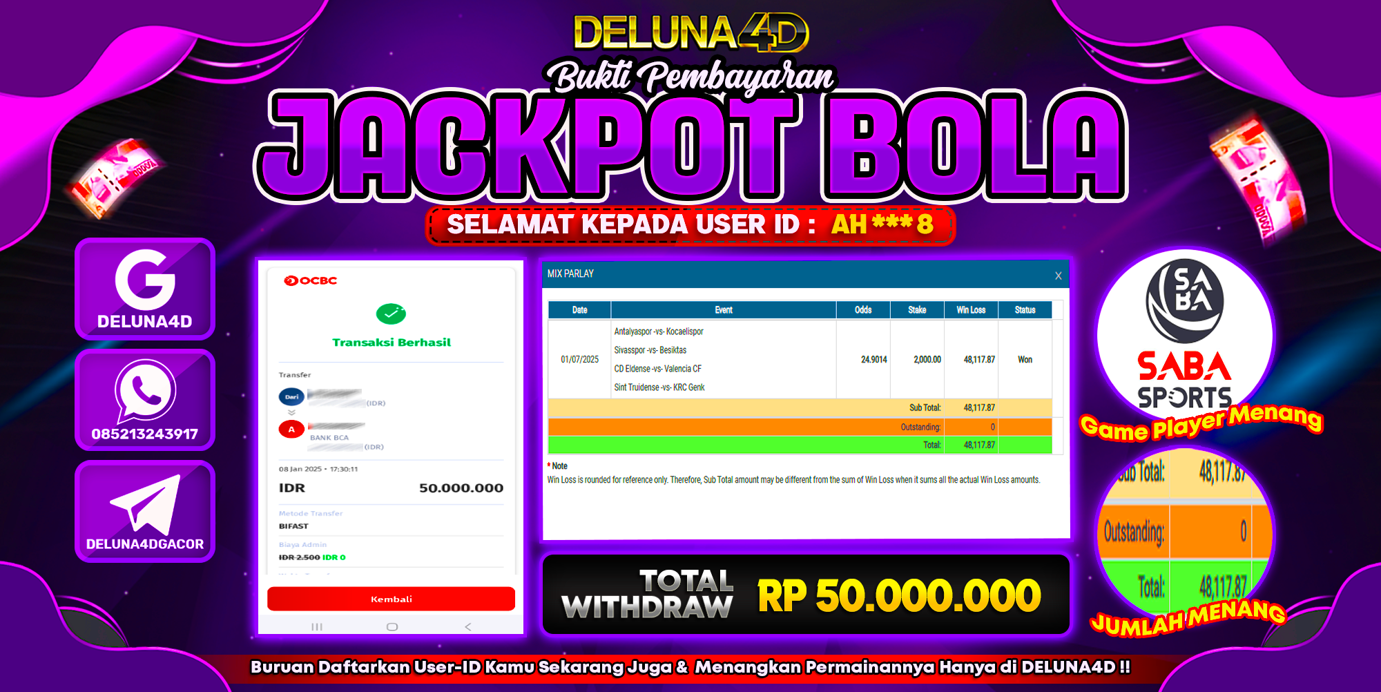 Selamat atas kemenangan User ID : AH***8, yang telah berhasil mendapatkan kemenangan di permainan SPORTBOOK SABA SPORT dengan kemenangan sebesar Rp 50.000.000,- . Setelah mengisi formulir withdraw, hanya dalam jangka waktu 3 – 5 menitan tim layanan pelanggan DELUNA4D telah berhasil mengirimkan semua saldo kemenangan ke User ID tersebut.