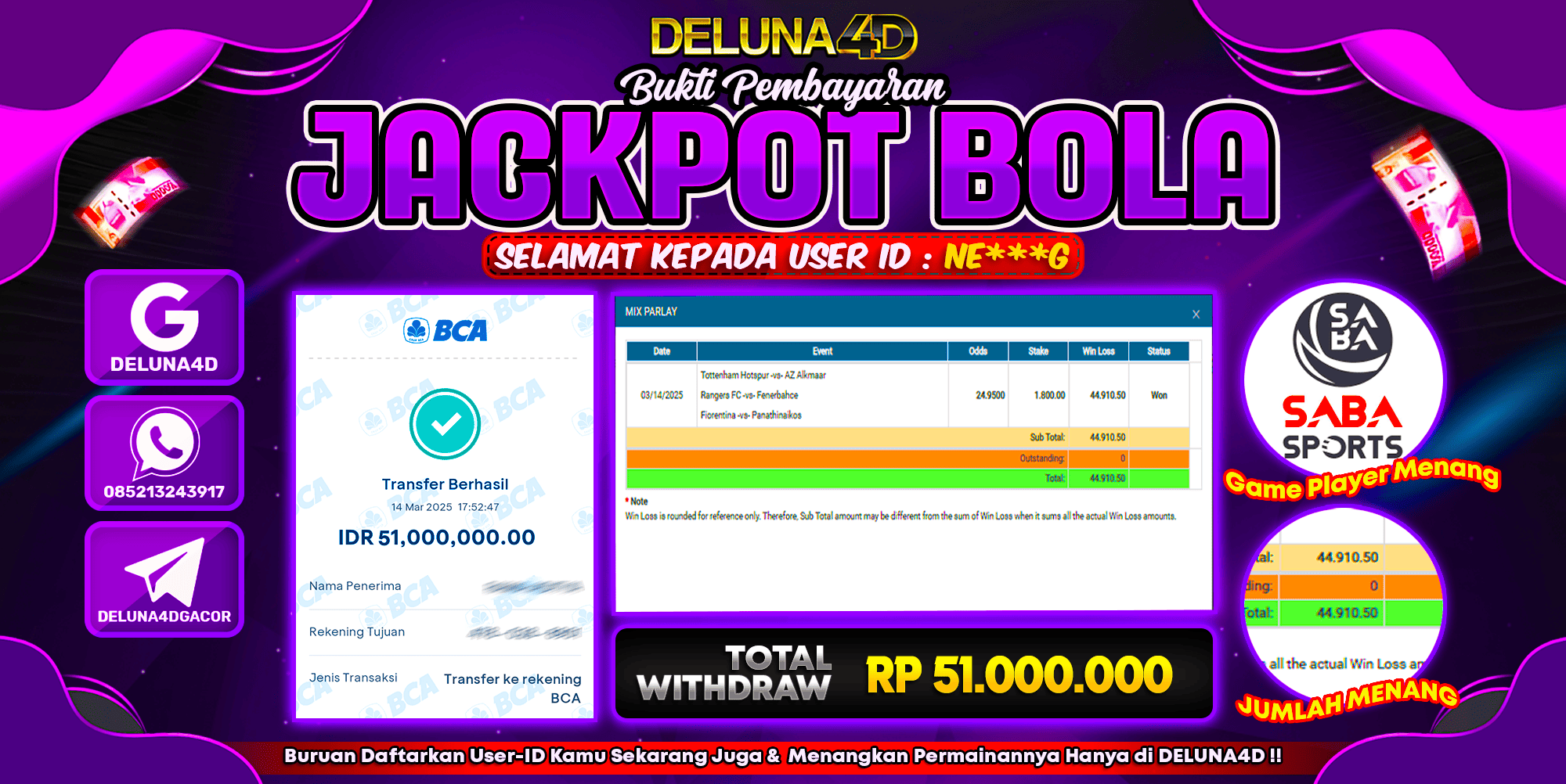 Selamat atas kemenangan User ID : NE***G, yang telah berhasil mendapatkan kemenangan di permainan SPORTBOOK SABA SPORTS dengan kemenangan sebesar Rp51.000.000,- . Setelah mengisi formulir withdraw, hanya dalam jangka waktu 3 – 5 menitan tim layanan pelanggan DELUNA4D telah berhasil mengirimkan semua saldo kemenangan ke User ID tersebut.