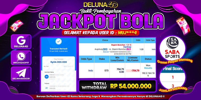 Selamat atas kemenangan User ID : MUJ***4, yang telah berhasil mendapatkan kemenangan di permainan SPORTBOOK SABA SPORTS dengan kemenangan sebesar Rp54.000.000,- . Setelah mengisi formulir withdraw, hanya dalam jangka waktu 3 – 5 menitan tim layanan pelanggan DELUNA4D telah berhasil mengirimkan semua saldo kemenangan ke User ID tersebut.