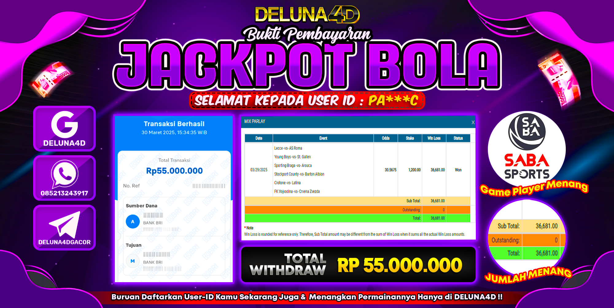 DELUNA4D JACKPOT SPORTBOOK SABA SPORTS Rp55.000.000,- LUNAS