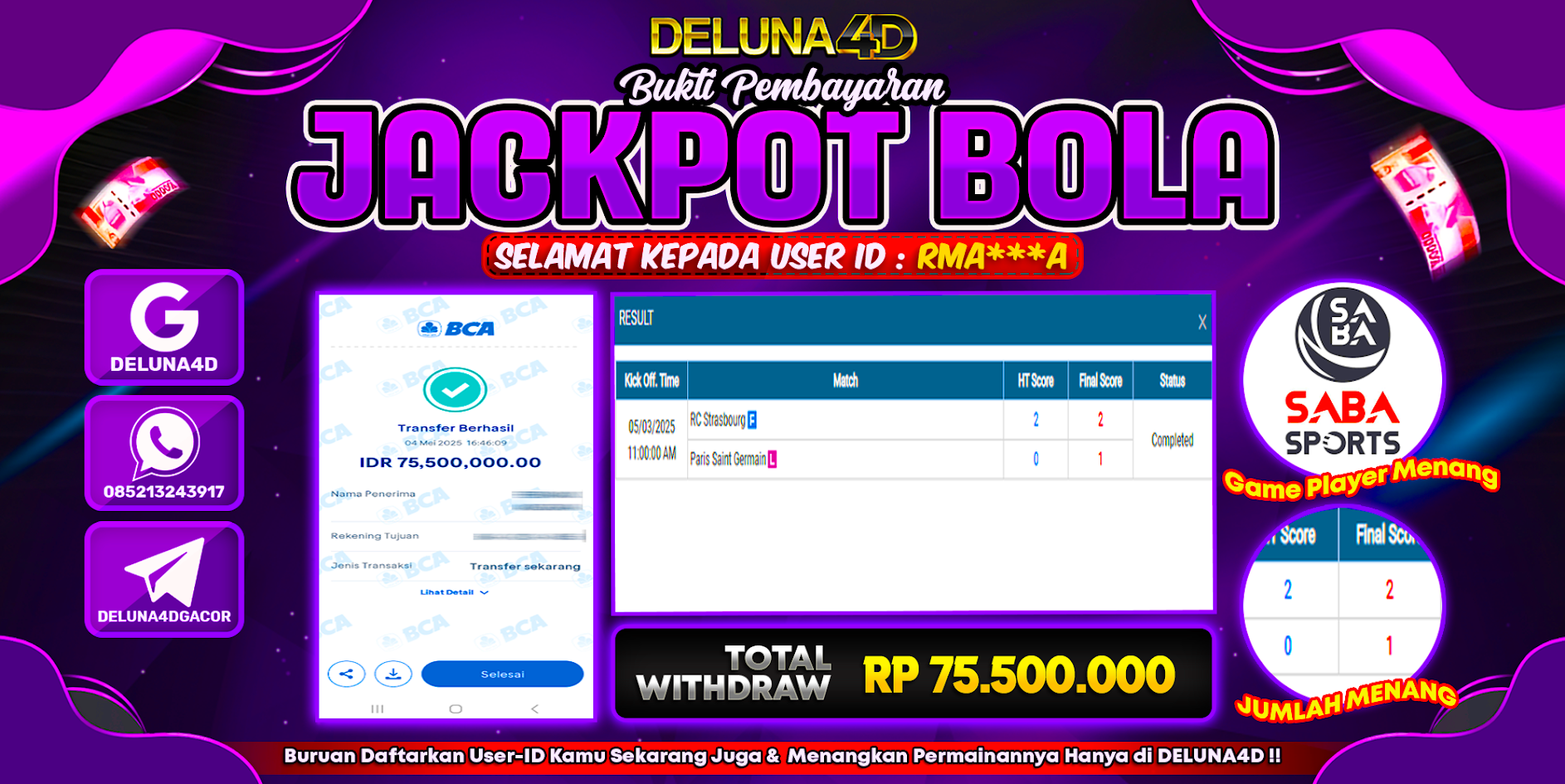 Selamat atas kemenangan User ID : RMA***A, yang telah berhasil mendapatkan kemenangan di permainan SPORTBOOK SABA SPORTS dengan kemenangan sebesar Rp75.500.000,- . Setelah mengisi formulir withdraw, hanya dalam jangka waktu 3 – 5 menitan tim layanan pelanggan DELUNA4D telah berhasil mengirimkan semua saldo kemenangan ke User ID tersebut.