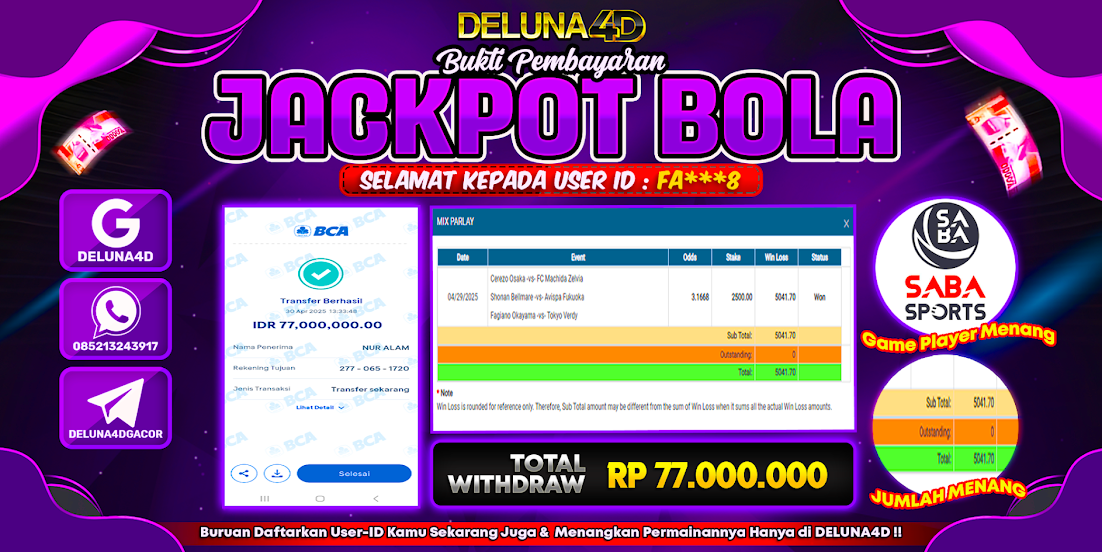 Selamat atas kemenangan User ID : FA***8, yang telah berhasil mendapatkan kemenangan di permainan SPORTBOOK SABA SPORTS dengan kemenangan sebesar Rp66.858.000,- . Setelah mengisi formulir withdraw, hanya dalam jangka waktu 3 – 5 menitan tim layanan pelanggan DELUNA4D telah berhasil mengirimkan semua saldo kemenangan ke User ID tersebut.