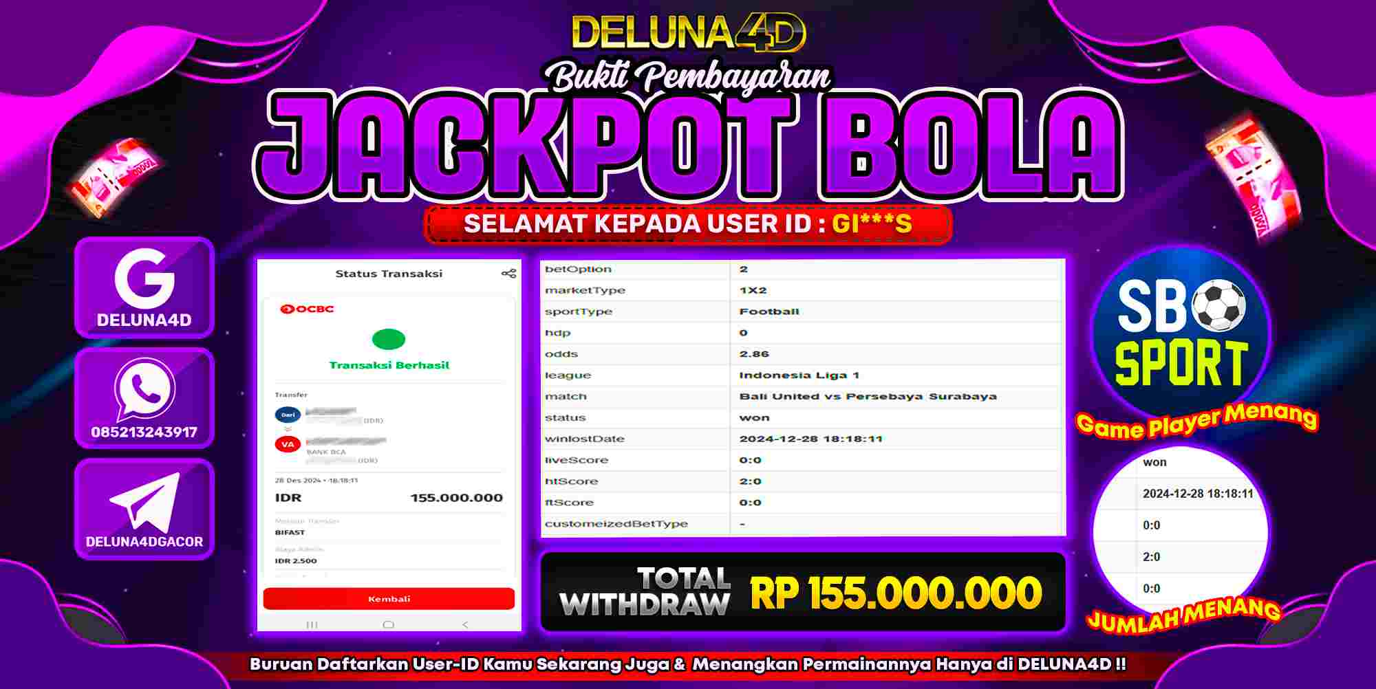 Selamat atas kemenangan User ID : GI***S, yang telah berhasil mendapatkan kemenangan di permainan SPORTBOOK SBO SPORT dengan kemenangan sebesar Rp 155.000.000,- . Setelah mengisi formulir withdraw, hanya dalam jangka waktu 3 – 5 menitan tim layanan pelanggan DELUNA4D telah berhasil mengirimkan semua saldo kemenangan ke User ID tersebut.