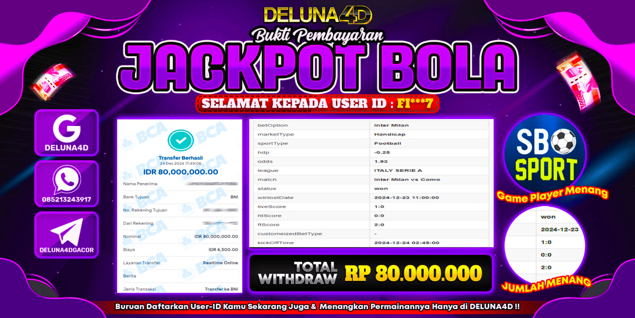 Selamat atas kemenangan User ID : FI***7, yang telah berhasil mendapatkan kemenangan di permainan SPORTBOOK SBO SPORT dengan kemenangan sebesar Rp 80.000.000,- . Setelah mengisi formulir withdraw, hanya dalam jangka waktu 3 – 5 menitan tim layanan pelanggan DELUNA4D telah berhasil mengirimkan semua saldo kemenangan ke User ID tersebut.